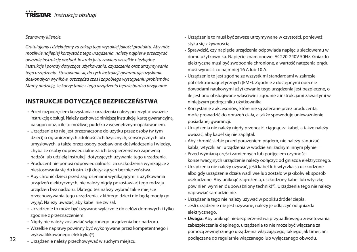 - Firma Tristar nie ponosi odpowiedzialności za szkody materialne lub obrażenia ciała spowodowane niewłaściwym użytkowaniem lub niestosowaniem się do instrukcji dotyczących bezpieczeństwa.