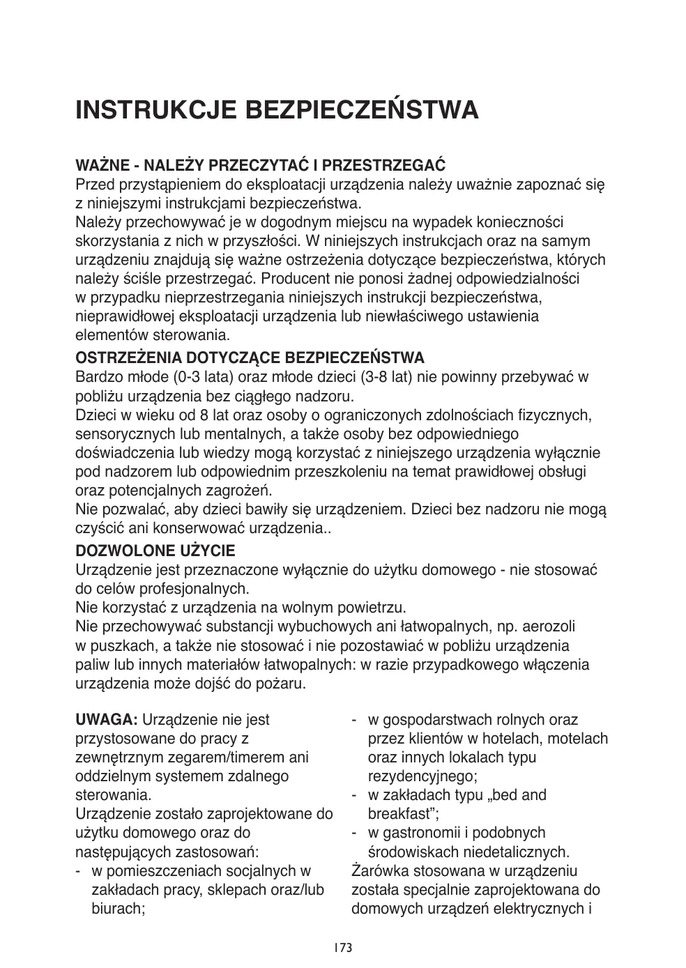 Les conserver à portée de main pour toute référence future. Les mises en garde contenues dans ces consignes de sécurité et sur l'appareil doivent toujours être respectées. Le fabricant décline toute responsabilité en cas de non-respect de ces consignes de sécurité, d'utilisation incorrecte de l'appareil ou de mauvais réglage des commandes. MISES EN GARDE Tenez les nourrissons (0-3 ans) et les jeunes enfants (3-8 ans) éloignés de l'appareil sauf en les tenant sous constante surveillance. Les enfants de 8 ans et plus ainsi que les personnes présentant des capacités physiques, sensorielles ou mentales réduites, ou ne possédant ni l'expérience ni les connaissances requises, peuvent utiliser cet appareil sous la surveillance ou les instructions d'une personne responsable leur ayant expliqué l'utilisation de l'appareil en toute sécurité, ainsi que les dangers potentiels. Ne laissez pas les enfants jouer avec l'appareil. Ne laissez pas les enfants nettoyer et procéder à l'entretien de l'appareil sans surveillance. EMPLOI AUTORISÉ Cet appareil est prévu pour un usage domestique et non professionnel. N'utilisez jamais l'appareil à l'extérieur. Ne stockez pas de substances explosives ou inflammables, comme des aérosols, et ne placez pas ou n'utiliser d'essence ou d'autres produits inflammables à proximité de l'appareil : un incendie pourrait se déclarer en cas de mise sous tension de l'appareil. ATTENTION ! L'appareil n'est pas prévu pour une utilisation au moyen d'une minuterie extérieure ou d'un système contrôlé à distance. Cet appareil a été conçu à des fins domestiques et pour des applications similaires, telles que : - cuisines pour le personnel de boutiques, bureaux et autres lieux de travail ; - gîtes et clients d'hôtels, de motels ou d'autres types d'hébergements ;