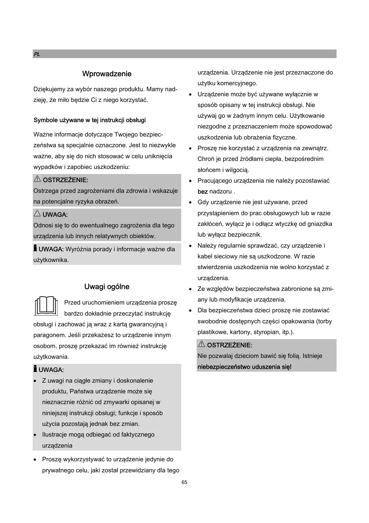 urzadzenia. Urzadzenie nie jest przeznaczone do uzytku komercyjnego. Urzadzenie moze byé uzywane wylacznie w sposéb opisany w tej instrukcji obstugi. Nie uzywaj go w Zadnym innym celu. Uzytkowanie niezgodne z przeznaczeniem moze spowodowaé uszkodzenia lub obrazenia fizyczne. Prosze nie korzystaé z urzadzenia na zewnatrz. Chroñ je przed Zrédtami ciepta, bezposrednim stoñcem i wilgocia. Pracujacego urzadzenia nie naleZy pozostawiaé bez nadzoru . Gdy urzadzenie nie jest uzywane, przed przystapieniem do prac obstugowych lub w razie zaktéceñ, wylacz je i odtacz wtyczke od gniazdka lub wytacz bezpiecznik. Nalezy regularnie sprawdzaé, czy urzadzenie i Kkabel sieciowy nie sa uszkodzone. W razie stwierdzenia uszkodzenia nie wolno korzystaé z urzadzenia. Ze wzgledéw bezpieczeñstwa zabronione sa zmi- any lub modyfikacje urzadzenia. Dla bezpieczeñstwa dzieci prosze nie zostawiaé swobodnie dostepnych cze$ci opakowania (torby plastikowe, kartony, styropian, itp.). À OSTRZEZENIE: Nie pozwalaj dzieciom bawié sie folia. Istnieje niebezpieczeñstwo uduszenia sie!