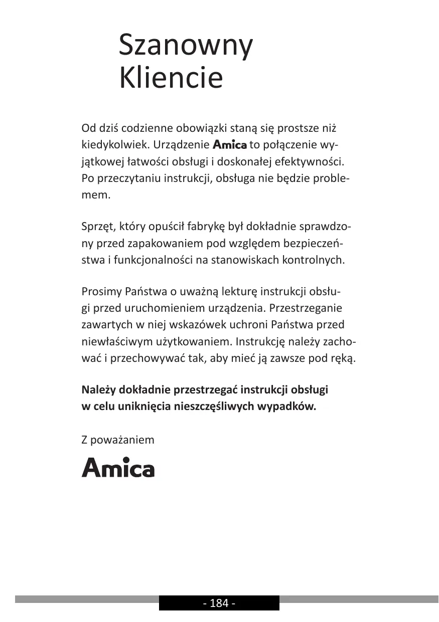 Szanowny Kliencie Od dziś codzienne obowiązki staną się prostsze niż kiedykolwiek. Urządzenie to połączenie wyjątkowej łatwości obsługi i doskonałej efektywności. Po przeczytaniu instrukcji, obsługa nie będzie problemem. Sprzęt, który opuścił fabrykę był dokładnie sprawdzony przed zapakowaniem pod względem bezpieczeństwa i funkcjonalności na stanowiskach kontrolnych. Prosimy Państwa o uważną lekturę instrukcji obsługi przed uruchomieniem urządzenia. Przestrzeganie zawartych w niej wskazówek uchroni Państwa przed niewłaściwym użytkowaniem. Instrukcję należy zachować i przechowywać tak, aby mieć ją zawsze pod ręką. Należy dokładnie przestrzegać instrukcji obsługi w celu uniknięcia nieszczęśliwych wypadków. Z poważaniem