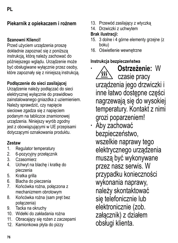 Cet appareil ne doit être branché que sur une prise de courant avec terre, installée selon les normes en vigueur. Assurez-vous que la tension d’alimentation correspond à la tension indiquée sur la plaque signalétique. Ce produit est conforme à toutes les directives relatives au marquage “CE”. Familiarisez-vous avec votre appareil 1. Sélecteur de température 2. Commutateur 6 positions 3. Minuterie 4. Poignée pour grille et plaque de four 5. Grille 6. Plaque de four 7. Embout du tournebroche (connexion du régulateur) 8. Embout du tournebroche (libre) 9. Plat ramasse-miettes 10. Palier de poignée du tournebroche 11. Tournebroche avec broches de maintien 12. Pierre à pizza 13. Cordon d’alimentation avec fiche 14. Porte du four avec poignée de la porte 18