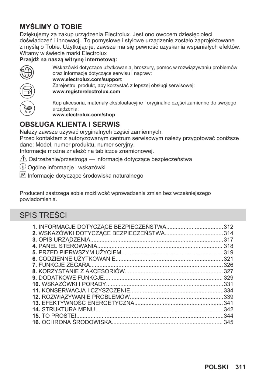 SPIS TREŚCI 1. INFORMACJE DOTYCZĄCE BEZPIECZEŃSTWA312 2. WSKAZÓWKI DOTYCZĄCE BEZPIECZEŃSTWA314 3. OPIS URZĄDZENIA317 4. PANEL STEROWANIA 318 5. PRZED PIERWSZYM UŻYCIEM 319 6. CODZIENNE UŻYTKOWANIE321 7. FUNKCJE ZEGARA 326 8. KORZYSTANIE Z AKCESORIÓW 327 9. DODATKOWE FUNKCJE 329 10. WSKAZÓWKI I PORADY331 11. KONSERWACJA I CZYSZCZENIE334 12. ROZWIĄZYWANIE PROBLEMÓW339 13. EFEKTYWNOŚĆ ENERGETYCZNA 341 14. STRUKTURA MENU342 15. TO PROSTE!344 16. OCHRONA ŚRODOWISKA 345
