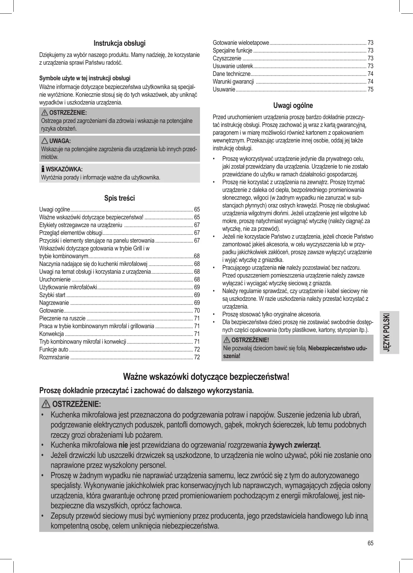 OSTRZEŻENIE: Kuchenka mikrofalowa jest przeznaczona do podgrzewania potraw i napojów. Suszenie jedzenia lub ubrań, podgrzewanie elektrycznych poduszek, pantofli domowych, gąbek, mokrych ściereczek, lub temu podobnych rzeczy grozi obrażeniami lub pożarem. Kuchenka mikrofalowa nie jest przewidziana do ogrzewania/ rozgrzewania żywych zwierząt. Jeżeli drzwiczki lub uszczelki drzwiczek są uszkodzone, to urządzenia nie wolno używać, póki nie zostanie ono naprawione przez wyszkolony personel. Proszę w żadnym wypadku nie naprawiać urządzenia samemu, lecz zwrócić się z tym do autoryzowanego specjalisty. Wykonywanie jakichkolwiek prac konserwacyjnych lub naprawczych, wymagających zdjęcia osłony urządzenia, która gwarantuje ochronę przed promieniowaniem pochodzącym z energii mikrofalowej, jest niebezpieczne dla wszystkich, oprócz fachowca. Zepsuty przewód sieciowy musi być wymieniony przez producenta, jego przedstawiciela handlowego lub inną kompetentną osobę, celem uniknięcia niebezpieczeństwa.
