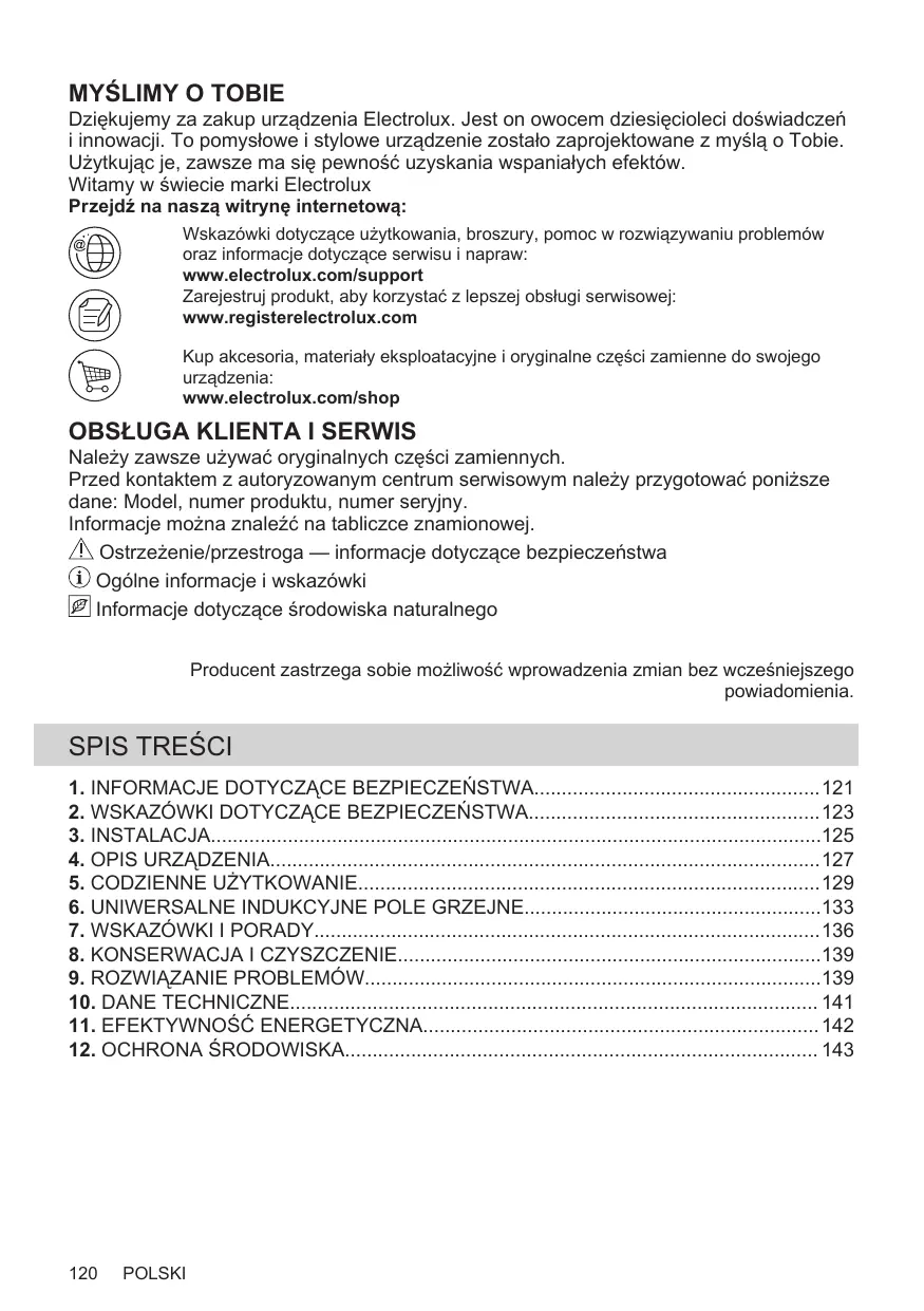 Dziękujemy za zakup urządzenia Electrolux. Jest on owocem dziesięcioleci doświadczeń i innowacji. To pomysłowe i stylowe urządzenie zostało zaprojektowane z myślą o Tobie. Użytkując je, zawsze ma się pewność uzyskania wspaniałych efektów. Witamy w świecie marki Electrolux Przejdź na naszą witrynę internetową: Wskazówki dotyczące użytkowania, broszury, pomoc w rozwiązywaniu problemów oraz informacje dotyczące serwisu i napraw: www.electrolux.com/support Zarejestruj produkt, aby korzystać z lepszej obsługi serwisowej: www.registerelectrolux.com Kup akcesoria, materiały eksploatacyjne i oryginalne części zamienne do swojego urządzenia: www.electrolux.com/shop