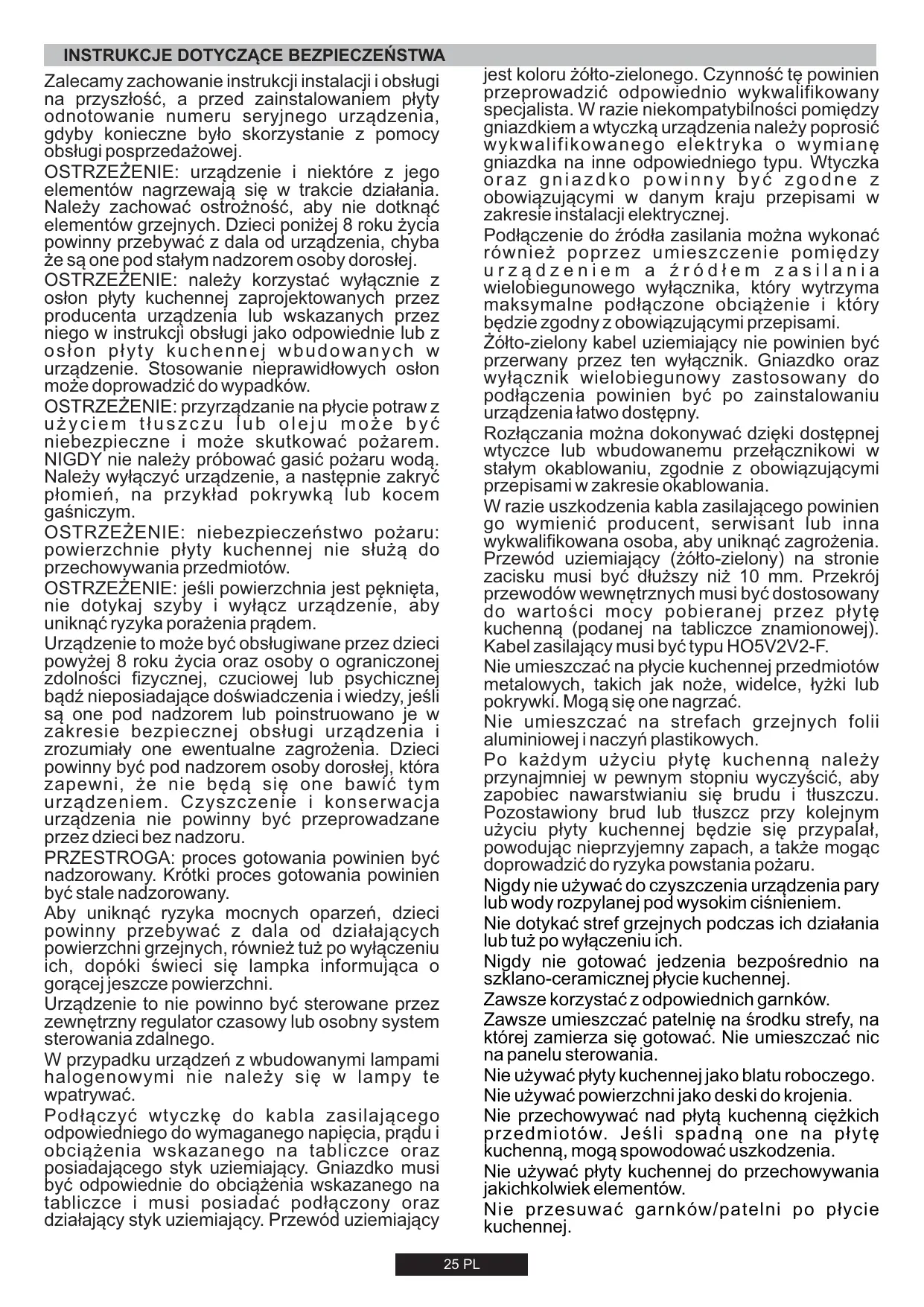 Il est possible de brancher l'appareil à la prise d'alimentation en installant un disjoncteur multipolaire qui supporte la charge électrique maximale, conformément aux lois en vigueur, entre l'appareil et la prise d'alimentation. Le conducteur jaune et vert de mise à la terre ne doit pas être bloqué par le disjoncteur. La prise d'alimentation ou le disjoncteur multipolaire utilisé pour le branchement doit rester à tout moment accessible lors de l'installation de l'appareil. Le débranchement doit se faire en accédant à la prise d'alimentation ou en prévoyant un interrupteur sur le circuit électrique fixe, conforme aux normes électriques. Si le câble d'alimentation est endommagé, il doit être remplacé par le fabricant, son agent d'entretien ou des personnes dotées du même type de qualification, afin d'éviter tout risque. Le conducteur de mise à la terre (jaune et vert) doit être plus long de 10 mm du côté de la plaque à bornes. Le diamètre interne du câble conducteur doit être proportionné à la puissance absorbée par la table de cuisson (indiquée sur l'étiquette). Le câble d'alimentation requis est le suivant : H05V2V2-F. Ne déposez jamais d'objets en métal, tels que des couteaux, fourchettes, cuillers ou couvercles sur la table de cuisson. Ils pourraient devenir brûlants. Ne posez jamais de papier aluminium ou de récipients en plastique sur les zones chauffantes. Après chaque utilisation, il convient de nettoyer la table de cuisson, afin d'éviter l'accumulation de saleté et de graisse. Dans le cas contraire, les résidus risquent de brûler lors de la prochaine utilisation de la table de cuisson, causant fumées et odeurs déplaisantes, pour ne pas mentionner les risques d'incendie. N'utilisez jamais de vaporisateur, ni de jet à haute pression pour nettoyer l'appareil. Ne touchez pas les zones chauffantes pendant qu'elles fonctionnent, ni pendant un certain temps après leur utilisation. Ne faites jamais cuire d'aliments directement sur la table de cuisson vitrocéramique. Utilisez toujours des ustensiles de cuisson adéquats. Placez toujours votre casserole au centre du foyer que vous utilisez. Ne déposez jamais aucun objet sur le panneau de commande. N'utilisez jamais votre table de cuisson comme plan de travail. N'utilisez pas la surface de la table de cuisson comme planche à découper. Ne rangez pas d'objets lourds sur votre table de cuisson. S'ils tombaient sur la table de cuisson, ils risqueraient de l'endommager. N'utilisez pas la table de cuisson pour ranger des objets. Ne faites pas glisser d'ustensiles de cuisine sur la table de cuisson. 09 FR