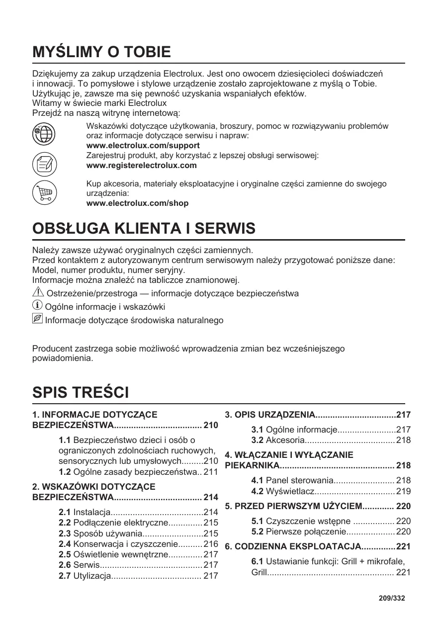 Dziękujemy za zakup urządzenia Electrolux. Jest ono owocem dziesięcioleci doświadczeń i innowacji. To pomysłowe i stylowe urządzenie zostało zaprojektowane z myślą o Tobie. Użytkując je, zawsze ma się pewność uzyskania wspaniałych efektów. Witamy w świecie marki Electrolux Przejdź na naszą witrynę internetową: Wskazówki dotyczące użytkowania, broszury, pomoc w rozwiązywaniu problemów oraz informacje dotyczące serwisu i napraw: www.electrolux.com/support Zarejestruj produkt, aby korzystać z lepszej obsługi serwisowej: www.registerelectrolux.com Kup akcesoria, materiały eksploatacyjne i oryginalne części zamienne do swojego urządzenia: www.electrolux.com/shop