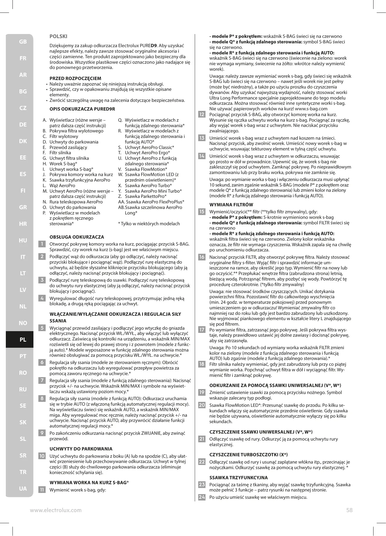Odkurzaczem PURED9 można odkurzać wyłącznie pomieszczenia w warunkach domowych. Odkurzacz należy przechowywać w suchym miejscu. Serwis i naprawy można wykonywać wyłącznie w autoryzowanym serwisie firmy Electrolux. Aby uniknąć uduszenia, materiały opakowaniowe, jak torby plastikowe należy trzymać w miejscu niedostępnym dla dzieci. Nigdy nie używać odkurzacza: gdy odkurzana powierzchnia jest mokra, w pobliżu łatwopalnych gazów itp., gdy urządzenie nosi wyraźne ślady uszkodzenia, do odkurzania przedmiotów z ostrymi krawędziami lub cieczy, gdy ssawka podłogowa nosi wyraźne ślady uszkodzenia, do odkurzania żarzących się lub zimnych węgli, tlących się niedopałków itp., do odkurzania drobnego pyłu – np. gipsu, cementu, mąki, gorącego lub zimnego popiołu. Nie wolno zostawiać odkurzacza w miejscu narażonym na działanie bezpośredniego światła słonecznego. Nie wystawiać odkurzacza na działanie wysokiej i niskiej temperatury (poniżej 0°C). Nigdy nie używać odkurzacza bez filtrów. Nie wolno dotykać wałka szczotki, gdy odkurzacz jest włączony, a wałek się obraca. Nie używać odkurzacza z zablokowanymi kółkami. danego modelu odkurzacza (patrz część 11). Uszkodzenia odkurzacza spowodowane nieprawidłowym użyciem nieoryginalnych worków na kurz nie są objęte gwarancją. UTYLIZACJA W urządzeniach oznaczonych tym symbolem znajduje się akumulator, którego nie wolno wyrzucać wraz z innymi odpadami z gospodarstwa domowego. Urządzenia oznaczonego tym symbolem nie wolno traktować tak, jak innych odpadów domowych. W celu poddania urządzenia recyklingowi należy zwrócić je do odpowiedniego punktu zbiórki odpadów lub centrum serwisowego firmy Electrolux, które zajmie się demontażem i utylizacją akumulatora i innych elementów elektrycznych w bezpieczny i profesjonalny sposób. Należy postępować zgodnie z krajowymi przepisami dotyczącymi selektywnej zbiórki urządzeń elektrycznych i akumulatorów. Niniejszym Electrolux Home Care oraz SDA, deklaruje, że odkurzacz z urządzeniem radiowym typu HER2 i HER3 jest zgodny z dyrektywą 2014/53/UE. Środki ostrożności dotyczące przewodu zasilającego Regularnie sprawdzać wtyczkę i przewód zasilający. Nigdy nie używać odkurzacza z uszkodzoną wtyczką lub przewodem zasilającym. Uszkodzenia przewodu zasilającego odkurzacza nie są objęte gwarancją. Nigdy na ciągnąć ani nie podnosić odkurzacza za przewód zasilający. Niezastosowanie się do powyższych zaleceń może skutkować poważnym skaleczeniem użytkownika lub uszkodzeniem urządzenia. Uszkodzenia tego typu nie są objęte gwarancją firmy Electrolux.
