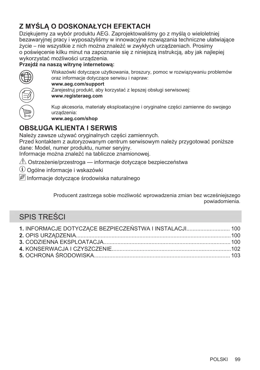 2 Obtenir des conseils d’utilisation, des brochures, un dépanneur, des informations sur le service et les réparations : www.aeg.com/support Enregistrer votre produit pour un meilleur service : www.registeraeg.com Acheter des accessoires, consommables et pièces de rechange d’origine pour votre appareil : www.aeg.com/shop