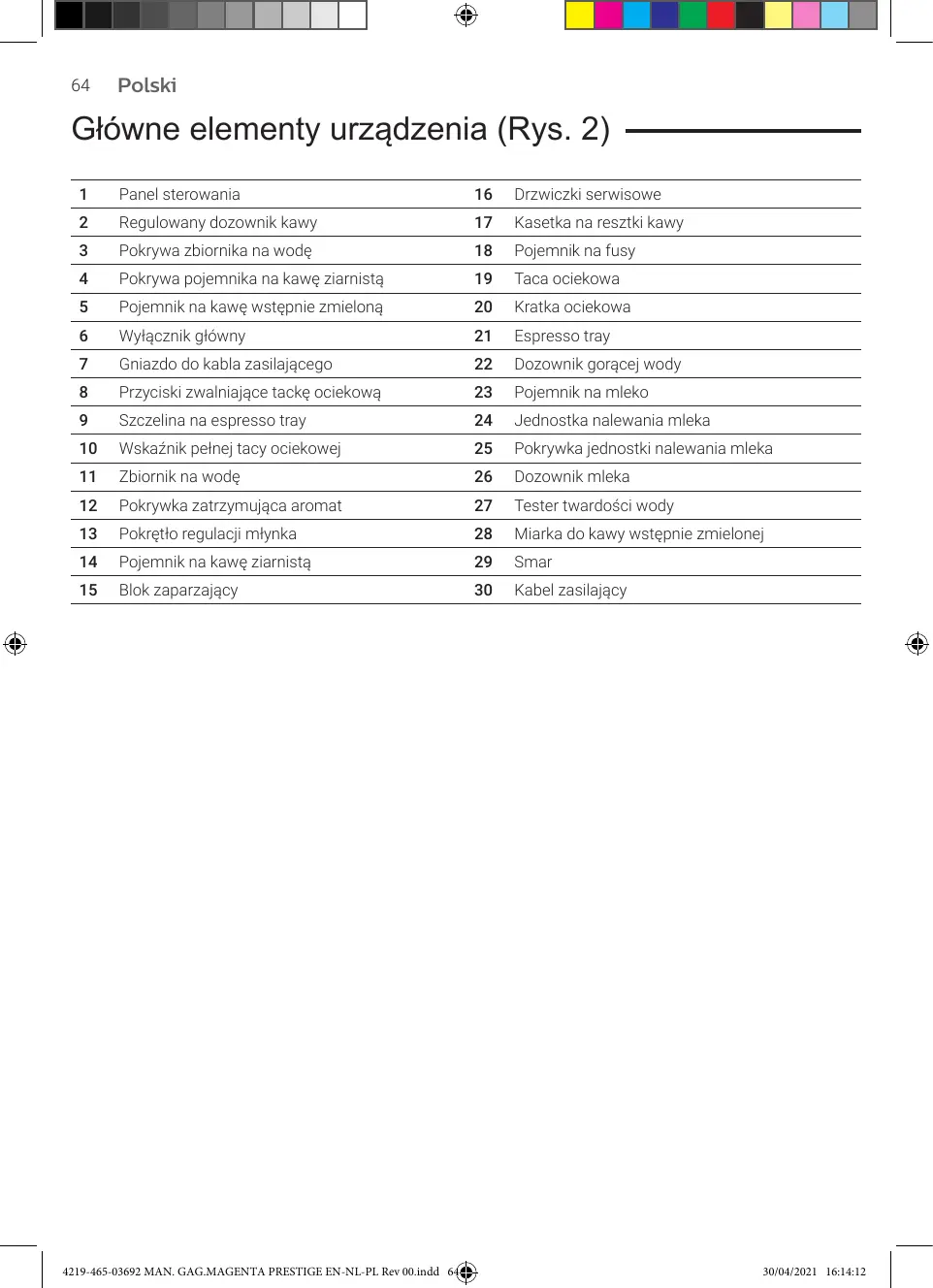 Indice Gtéwne elementy urzadzenia (Rys. 2) 64 Panel sterowania i wy$wietlacz 65 Glôwne elementy panelu sterowania (Rys. 1) 65 Przyciski wielofunkcyjne 65 Pierwsza instalacja 66 Reczny cykl plukania 66 Pomiar twardoéci wody 67 Filtr wody INTENZA+ 67 Instalacja filtra wody INTENZA+ 68 Wymiana filtra wody INTENZA+ 68 Rodzaje napojéw 69 Espresso tray 70 Parzenie kawy 70 Parzenie kawy na bazie kawy ziarnistej 70 Parzenie kawy na bazie kawy wstepnie zmielonej 71 Przygotowywanie napojéw na bazie kawy i spienionego mleka 72 Napeinianie dzbanka na mleko 72 Wkladanie dzbanka na mleko 73 Wyimowanie dzbanka na mleko 73 Nalewanie napojôw na bazie kawy i spienionego mleka 73 Nalewanie goracej wody 74 Indywidualne ustawienia napojéw i zapisywanie ustawieñ (MEMO) 75 Indywidualne ustawienia napojéw 75 Regulacja stopnia mielenia 76 Czyszczenie i konserwacja 77 Tabela czyszczenia 77 Czyszczenie dzbanka na mleko 78 Czyszczenie bloku zaparzajacego 79 Smarowanie bloku zaparzajacego 82 Odwapnianie 83 Procedura odwapniania 83 Co robié w przypadku przerwania procedury odwapniania 84 Ustawienia réZne 84 Jezyk 84 Filtr wody 85 Czas czuwania 85 Jednostki miary 85 Twardo$é wody 85 Licznik napojéw 85 Däwiek przyciskôw 85 Ustawienia fabryczne 85 Znaczenie kodéw bledéw 86 Rozwiagzywanie probleméw 87 Akcesoria GAGGIA 90 Dane techniczne 91