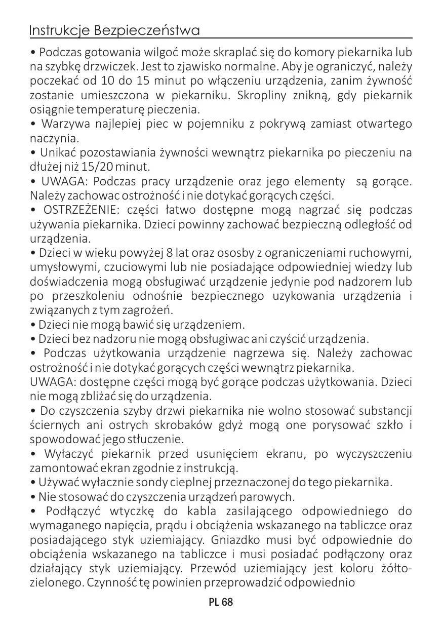 Instrukcje Bezpieczeństwa • Podczas gotowania wilgoć może skraplać się do komory piekarnika lub na szybkę drzwiczek. Jest to zjawisko normalne. Aby je ograniczyć, należy poczekać od 10 do 15 minut po włączeniu urządzenia, zanim żywność zostanie umieszczona w piekarniku. Skropliny znikną, gdy piekarnik osiągnie temperaturę pieczenia. • Warzywa najlepiej piec w pojemniku z pokrywą zamiast otwartego naczynia. • Unikać pozostawiania żywności wewnątrz piekarnika po pieczeniu na dłużej niż 15/20 minut. • UWAGA: Podczas pracy urządzenie oraz jego elementy są gorące. Należy zachowac ostrożność i nie dotykać gorących części. • OSTRZEŻENIE: części łatwo dostępne mogą nagrzać się podczas używania piekarnika. Dzieci powinny zachować bezpieczną odległość od urządzenia. • Dzieci w wieku powyżej 8 lat oraz ososby z ograniczeniami ruchowymi, umysłowymi, czuciowymi lub nie posiadające odpowiedniej wiedzy lub doświadczenia mogą obsługiwać urządzenie jedynie pod nadzorem lub po przeszkoleniu odnośnie bezpiecznego uzykowania urządzenia i związanych z tym zagrożeń. • Dzieci nie mogą bawić się urządzeniem. • Dzieci bez nadzoru nie mogą obsługiwac ani czyścić urządzenia. • Podczas użytkowania urządzenie nagrzewa się. Należy zachowac ostrożność i nie dotykać gorących części wewnątrz piekarnika. UWAGA: dostępne części mogą być gorące podczas użytkowania. Dzieci nie mogą zbliżać się do urządzenia. • Do czyszczenia szyby drzwi piekarnika nie wolno stosować substancji ściernych ani ostrych skrobaków gdyż mogą one porysować szkło i spowodować jego stłuczenie. • Wyłaczyć piekarnik przed usunięciem ekranu, po wyczyszczeniu zamontować ekran zgodnie z instrukcją. • Używać wyłacznie sondy cieplnej przeznaczonej do tego piekarnika. • Nie stosować do czyszczenia urządzeń parowych. • Podłączyć wtyczkę do kabla zasilającego odpowiedniego do wymaganego napięcia, prądu i obciążenia wskazanego na tabliczce oraz posiadającego styk uziemiający. Gniazdko musi być odpowiednie do obciążenia wskazanego na tabliczce i musi posiadać podłączony oraz działający styk uziemiający. Przewód uziemiający jest koloru żółtozielonego. Czynność tę powinien przeprowadzić odpowiednio PL 68