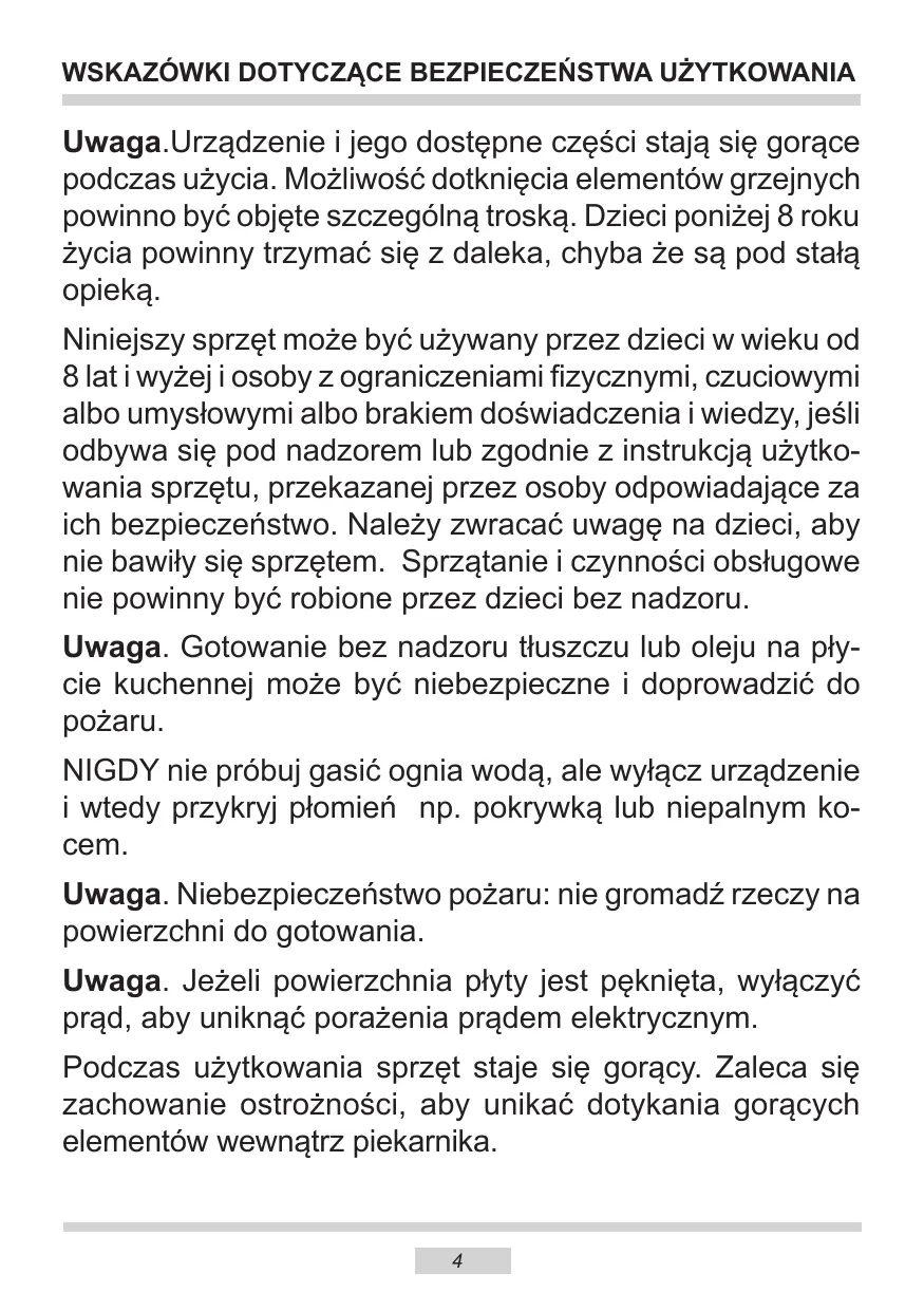WSKAZÓWKI DOTYCZĄCE BEZPIECZEŃSTWA UŻYTKOWANIA Uwaga.Urządzenie i jego dostępne części stają się gorące podczas użycia. Możliwość dotknięcia elementów grzejnych powinno być objęte szczególną troską. Dzieci poniżej 8 roku życia powinny trzymać się z daleka, chyba że są pod stałą opieką. Niniejszy sprzęt może być używany przez dzieci w wieku od 8 lat i wyżej i osoby z ograniczeniami fizycznymi, czuciowymi albo umysłowymi albo brakiem doświadczenia i wiedzy, jeśli odbywa się pod nadzorem lub zgodnie z instrukcją użytkowania sprzętu, przekazanej przez osoby odpowiadające za ich bezpieczeństwo. Należy zwracać uwagę na dzieci, aby nie bawiły się sprzętem. Sprzątanie i czynności obsługowe nie powinny być robione przez dzieci bez nadzoru. Uwaga. Gotowanie bez nadzoru tłuszczu lub oleju na płycie kuchennej może być niebezpieczne i doprowadzić do pożaru. NIGDY nie próbuj gasić ognia wodą, ale wyłącz urządzenie i wtedy przykryj płomień np. pokrywką lub niepalnym kocem. Uwaga. Niebezpieczeństwo pożaru: nie gromadź rzeczy na powierzchni do gotowania. Uwaga. Jeżeli powierzchnia płyty jest pęknięta, wyłączyć prąd, aby uniknąć porażenia prądem elektrycznym. Podczas użytkowania sprzęt staje się gorący. Zaleca się zachowanie ostrożności, aby unikać dotykania gorących elementów wewnątrz piekarnika.