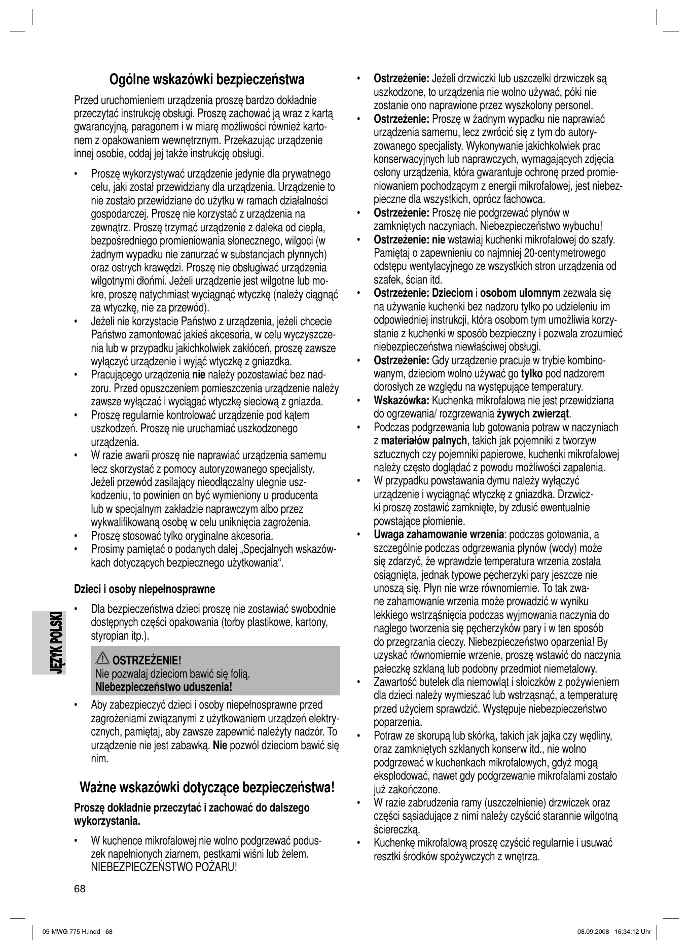 Ostrzeżenie: Jeżeli drzwiczki lub uszczelki drzwiczek są uszkodzone, to urządzenia nie wolno używać, póki nie zostanie ono naprawione przez wyszkolony personel. Ostrzeżenie: Proszę w żadnym wypadku nie naprawiać urządzenia samemu, lecz zwrócić się z tym do autoryzowanego specjalisty. Wykonywanie jakichkolwiek prac konserwacyjnych lub naprawczych, wymagających zdjęcia osłony urządzenia, która gwarantuje ochronę przed promieniowaniem pochodzącym z energii mikrofalowej, jest niebezpieczne dla wszystkich, oprócz fachowca. Ostrzeżenie: Proszę nie podgrzewać płynów w zamkniętych naczyniach. Niebezpieczeństwo wybuchu! Ostrzeżenie: nie wstawiaj kuchenki mikrofalowej do szafy. Pamiętaj o zapewnieniu co najmniej 20-centymetrowego odstępu wentylacyjnego ze wszystkich stron urządzenia od szafek, ścian itd. Ostrzeżenie: Dzieciom i osobom ułomnym zezwala się na używanie kuchenki bez nadzoru tylko po udzieleniu im odpowiedniej instrukcji, która osobom tym umożliwia korzystanie z kuchenki w sposób bezpieczny i pozwala zrozumieć niebezpieczeństwa niewłaściwej obsługi. Ostrzeżenie: Gdy urządzenie pracuje w trybie kombinowanym, dzieciom wolno używać go tylko pod nadzorem dorosłych ze względu na występujące temperatury. Wskazówka: Kuchenka mikrofalowa nie jest przewidziana do ogrzewania/ rozgrzewania żywych zwierząt. Podczas podgrzewania lub gotowania potraw w naczyniach z materiałów palnych, takich jak pojemniki z tworzyw sztucznych czy pojemniki papierowe, kuchenki mikrofalowej należy często doglądać z powodu możliwości zapalenia. W przypadku powstawania dymu należy wyłączyć urządzenie i wyciągnąć wtyczkę z gniazdka. Drzwiczki proszę zostawić zamknięte, by zdusić ewentualnie powstające płomienie. Uwaga zahamowanie wrzenia: podczas gotowania, a szczególnie podczas odgrzewania płynów (wody) może się zdarzyć, że wprawdzie temperatura wrzenia została osiągnięta, jednak typowe pęcherzyki pary jeszcze nie unoszą się. Płyn nie wrze równomiernie. To tak zwane zahamowanie wrzenia może prowadzić w wyniku lekkiego wstrząśnięcia podczas wyjmowania naczynia do nagłego tworzenia się pęcherzyków pary i w ten sposób do przegrzania cieczy. Niebezpieczeństwo oparzenia! By uzyskać równomiernie wrzenie, proszę wstawić do naczynia pałeczkę szklaną lub podobny przedmiot niemetalowy. Zawartość butelek dla niemowląt i słoiczków z pożywieniem dla dzieci należy wymieszać lub wstrząsnąć, a temperaturę przed użyciem sprawdzić. Występuje niebezpieczeństwo poparzenia. Potraw ze skorupą lub skórką, takich jak jajka czy wędliny, oraz zamkniętych szklanych konserw itd., nie wolno podgrzewać w kuchenkach mikrofalowych, gdyż mogą eksplodować, nawet gdy podgrzewanie mikrofalami zostało już zakończone. W razie zabrudzenia ramy (uszczelnienie) drzwiczek oraz części sąsiadujące z nimi należy czyścić starannie wilgotną ściereczką. Kuchenkę mikrofalową proszę czyścić regularnie i usuwać resztki środków spożywczych z wnętrza.