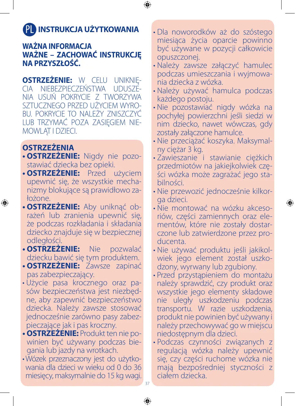 •AVERTISSEMENT : Pour éviter toute blessure, maintenir votre enfant à l’écart lors du dépliage et du pliage du produit. •AVERTISSEMENT : Ne pas laisser votre enfant jouer avec ce produit. • AVERTISSEMENT : Toujours utiliser le système de retenue. • L’utilisation de l’entrejambe et du harnais de sécurité est indispensable pour garantir la sécurité de l’enfant. Ne jamais utiliser l’entrejambe sans le harnais de sécurité. •A VERTISSEMENT : Ce produit ne convient pas pour faire du jogging ou des promenades en rollers. • L’utilisation de la poussette est autorisée pour des enfants d’un âge compris entre 0 et 36 mois, jusqu’à un poids maximum de 15 kg. • De la naissance de l’enfant à ses 6 mois environ, le dossier doit être 14