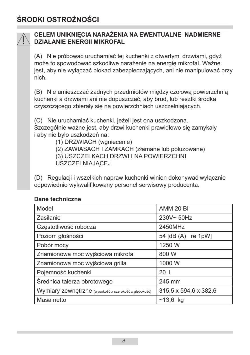 USZCZELNIAJĄCEJ (D) Regulacji i wszelkich napraw kuchenki winien dokonywać wyłącznie odpowiednio wykwalifikowany personel serwisowy producenta. Dane techniczne Model AMM 20 BI Zasilanie 230V~ 50Hz Częstotliwość robocza 2450MHz Poziom głośności 54 [dB (A) re 1pW] Pobór mocy 1250 W Znamionowa moc wyjściowa mikrofal 800 W Znamionowa moc wyjściowa grilla 1000 W Pojemność kuchenki 20 l Średnica talerza obrotowego 245 mm Wymiary zewnętrzne (wysokość x szerokość x głębokość) 315,5 x 594,6 x 382,6 Masa netto ~13,6 kg