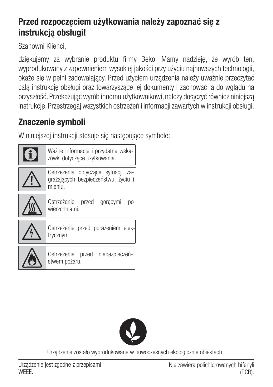 Przed rozpoczęciem użytkowania należy zapoznać się z instrukcją obsługi! Szanowni Klienci, dziękujemy za wybranie produktu firmy Beko. Mamy nadzieję, że wyrób ten, wyprodukowany z zapewnieniem wysokiej jakości przy użyciu najnowszych technologii, okaże się w pełni zadowalający. Przed użyciem urządzenia należy uważnie przeczytać całą instrukcję obsługi oraz towarzyszące jej dokumenty i zachować ją do wglądu na przyszłość. Przekazując wyrób innemu użytkownikowi, należy dołączyć również niniejszą instrukcję. Przestrzegaj wszystkich ostrzeżeń i informacji zawartych w instrukcji obsługi.