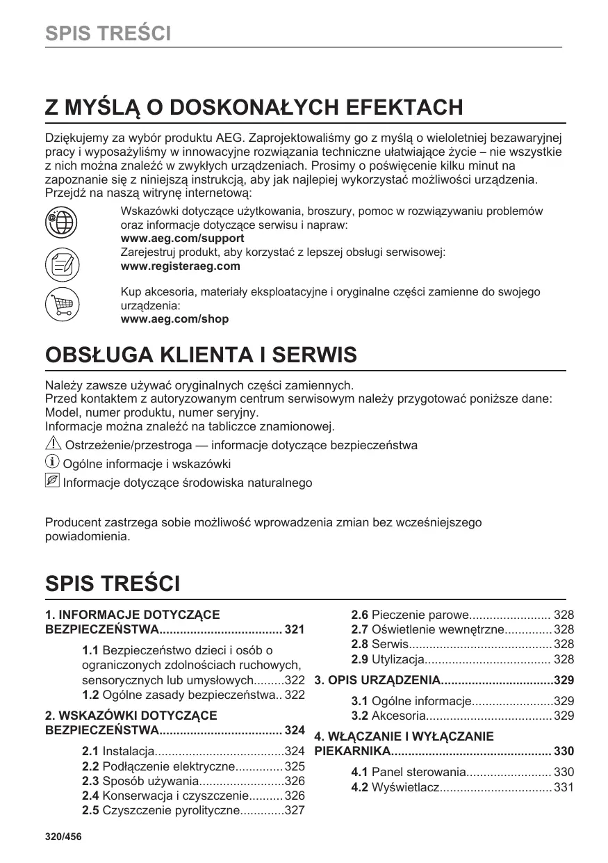 Z MYŚLĄ O DOSKONAŁYCH EFEKTACH Dziękujemy za wybór produktu AEG. Zaprojektowaliśmy go z myślą o wieloletniej bezawaryjnej pracy i wyposażyliśmy w innowacyjne rozwiązania techniczne ułatwiające życie – nie wszystkie z nich można znaleźć w zwykłych urządzeniach. Prosimy o poświęcenie kilku minut na zapoznanie się z niniejszą instrukcją, aby jak najlepiej wykorzystać możliwości urządzenia. Przejdź na naszą witrynę internetową: Wskazówki dotyczące użytkowania, broszury, pomoc w rozwiązywaniu problemów oraz informacje dotyczące serwisu i napraw: www.aeg.com/support Zarejestruj produkt, aby korzystać z lepszej obsługi serwisowej: www.registeraeg.com Kup akcesoria, materiały eksploatacyjne i oryginalne części zamienne do swojego urządzenia: www.aeg.com/shop