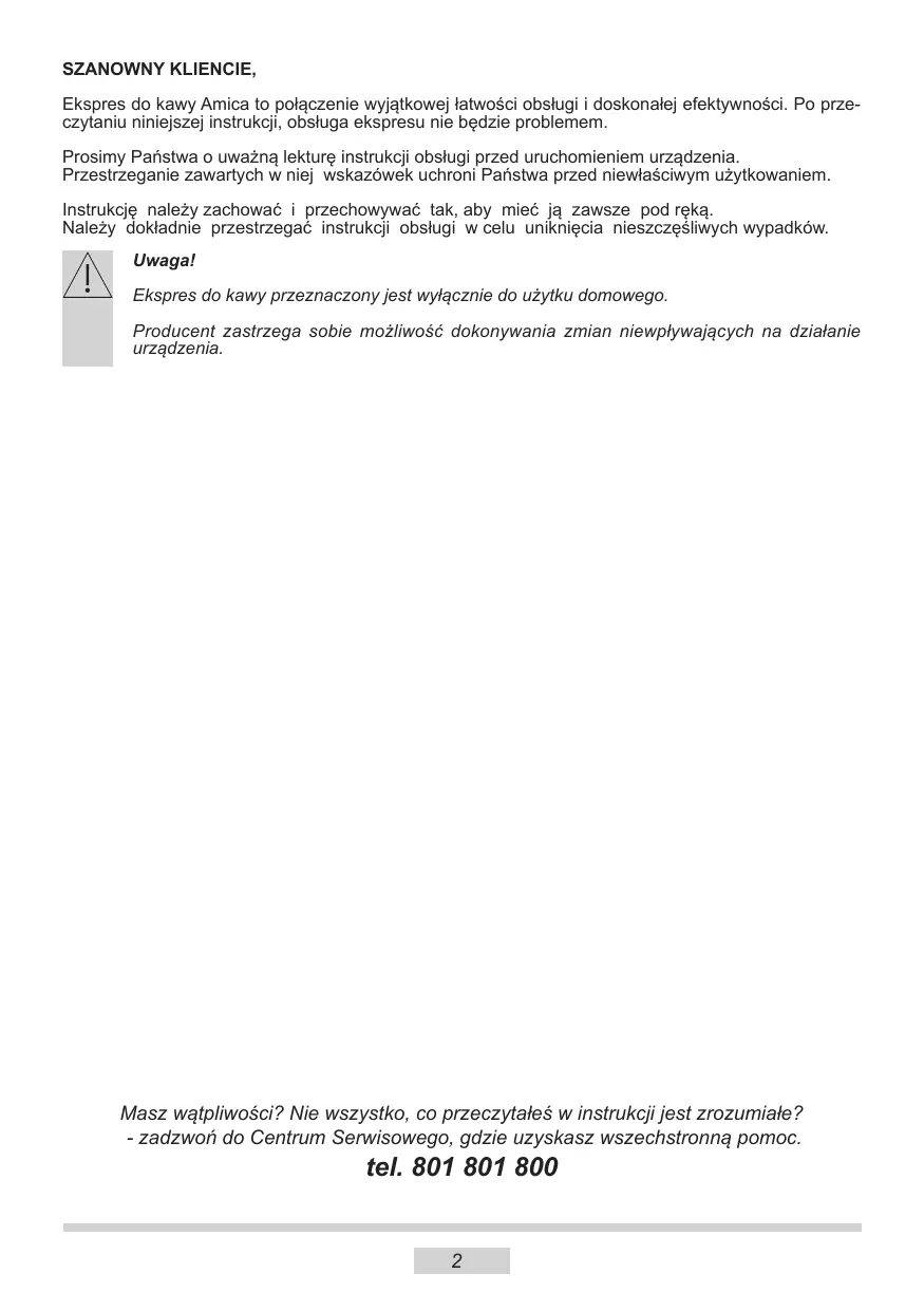 SZANOWNY KLIENCIE, Ekspres do kawy Amica to połączenie wyjątkowej łatwości obsługi i doskonałej efektywności. Po prze czytaniu niniejszej instrukcji, obsługa ekspresu nie będzie problemem. Prosimy Państwa o uważną lekturę instrukcji obsługi przed uruchomieniem urządzenia. Przestrzeganie zawartych w niej wskazówek uchroni Państwa przed niewłaściwym użytkowaniem. Instrukcję należy zachować i przechowywać tak, aby mieć ją zawsze pod ręką. Należy dokładnie przestrzegać instrukcji obsługi w celu uniknięcia nieszczęśliwych wypadków. Uwaga! Ekspres do kawy przeznaczony jest wyłącznie do użytku domowego. Producent zastrzega sobie możliwość dokonywania zmian niewpływających na działanie urządzenia. Masz wątpliwości? Nie wszystko, co przeczytałeś w instrukcji jest zrozumiałe? - zadzwoń do Centrum Serwisowego, gdzie uzyskasz wszechstronną pomoc. tel. 801 801 800