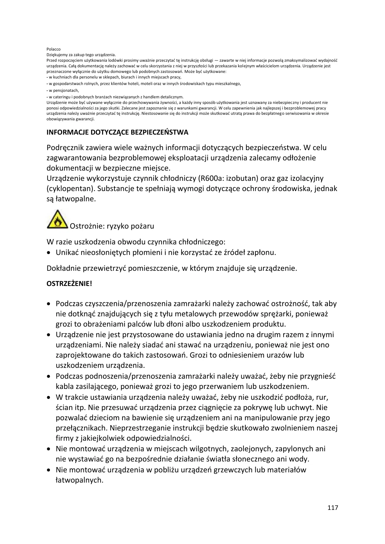 Podręcznik zawiera wiele ważnych informacji dotyczących bezpieczeństwa. W celu zagwarantowania bezproblemowej eksploatacji urządzenia zalecamy odłożenie dokumentacji w bezpieczne miejsce. Urządzenie wykorzystuje czynnik chłodniczy (R600a: izobutan) oraz gaz izolacyjny (cyklopentan). Substancje te spełniają wymogi dotyczące ochrony środowiska, jednak są łatwopalne. Ostrożnie: ryzyko pożaru W razie uszkodzenia obwodu czynnika chłodniczego: