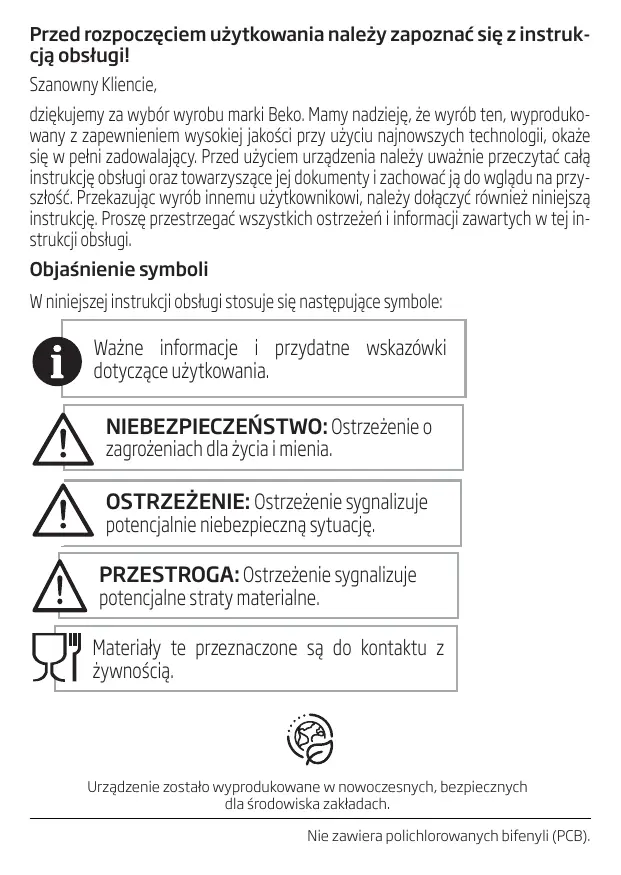 Przed rozpoczęciem użytkowania należy zapoznać się z instrukcją obsługi! Szanowny Kliencie, dziękujemy za wybór wyrobu marki Beko. Mamy nadzieję, że wyrób ten, wyprodukowany z zapewnieniem wysokiej jakości przy użyciu najnowszych technologii, okaże się w pełni zadowalający. Przed użyciem urządzenia należy uważnie przeczytać całą instrukcję obsługi oraz towarzyszące jej dokumenty i zachować ją do wglądu na przyszłość. Przekazując wyrób innemu użytkownikowi, należy dołączyć również niniejszą instrukcję. Proszę przestrzegać wszystkich ostrzeżeń i informacji zawartych w tej instrukcji obsługi. Objaśnienie symboli W niniejszej instrukcji obsługi stosuje się następujące symbole: