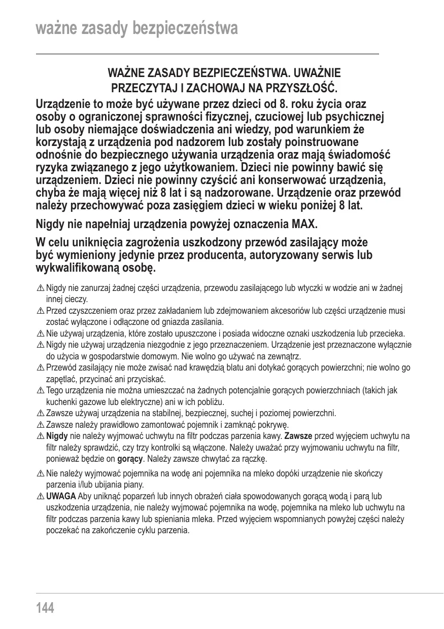 Ne dépassez pas la marque MAX. Si le cordon d’alimentation est endommagé, il doit être remplacé par le fabricant, son représentant agréé ou toute autre personne qualifiée afin d’éviter tout danger. !!Ne plongez pas, même partiellement, l’appareil ou son cordon dans du liquide. !!Assurez-vous que l’appareil est arrêté et débranché après utilisation et avant son nettoyage, ou encore pour monter/retirer un accessoire ou des pièces. !!N’utilisez pas l’appareil s’il a subi un choc, ou en cas de signes visibles de dommages ou en cas de fuite. !!N’utilisez ce produit qu’aux fins pour lesquelles il est prévu. Cet appareil est conçu exclusivement pour une utilisation domestique. N’utilisez pas cet appareil à l’extérieur. !!Ne laissez pas le cordon d’alimentation pendre dans le vide, toucher des surfaces chaudes ou s’emmêler, se bloquer ou se pincer. !!Cet appareil ne doit pas être placé sur ou près de surfaces potentiellement chaudes (telles que des plaques de cuisson au gaz ou à l’électricité). !!Utilisez toujours l’appareil sur une surface stable, sûre, sèche et horizontale. !!Replacez toujours le réservoir d’eau correctement et fermez le couvercle. !!N’enlevez jamais le porte filtre lorsque le café est en cours d’infusion. Assurez-vous toujours que les voyants des trois boutons sont allumés avant d’enlever le porte filtre. Manipulez le porte filtre avec précautions, car il peut être brûlant. Tenez-le toujours par sa poignée. !!Ne retirez pas le réservoir d’eau ou de lait tant pendant les opérations d’infusion et/ou de formation de mousse. !!ATTENTION Afin d’éviter les brûlures, les ébouillantages et/ou autres blessures résultant du contact avec de la vapeur et de l’eau chaude, ou pour ne pas endommager l’appareil, n’enlevez sous aucun prétexte le réservoir à eau ou lait, ou le porte filtre pendant une opération d’infusion ou de formation de mousse. Attendez la fin du cycle d’infusion avant de retirer ces pièces.