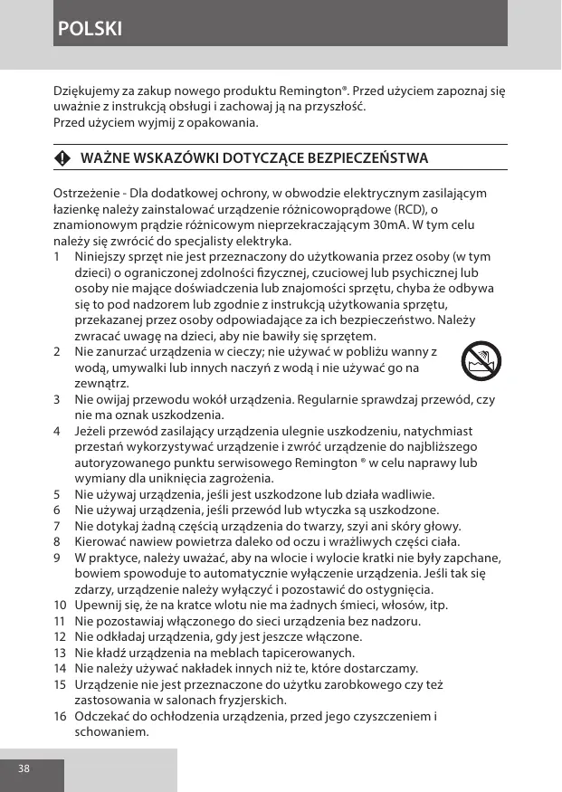 POLSKI Dziękujemy za zakup nowego produktu Remington®. Przed użyciem zapoznaj się uważnie z instrukcją obsługi i zachowaj ją na przyszłość. Przed użyciem wyjmij z opakowania. F WAŻNE WSKAZÓWKI DOTYCZĄCE BEZPIECZEŃSTWA Ostrzeżenie - Dla dodatkowej ochrony, w obwodzie elektrycznym zasilającym łazienkę należy zainstalować urządzenie różnicowoprądowe (RCD), o znamionowym prądzie różnicowym nieprzekraczającym 30mA. W tym celu należy się zwrócić do specjalisty elektryka. 1 Niniejszy sprzęt nie jest przeznaczony do użytkowania przez osoby (w tym dzieci) o ograniczonej zdolności fizycznej, czuciowej lub psychicznej lub osoby nie mające doświadczenia lub znajomości sprzętu, chyba że odbywa się to pod nadzorem lub zgodnie z instrukcją użytkowania sprzętu, przekazanej przez osoby odpowiadające za ich bezpieczeństwo. Należy zwracać uwagę na dzieci, aby nie bawiły się sprzętem. 2 Nie zanurzać urządzenia w cieczy; nie używać w pobliżu wanny z wodą, umywalki lub innych naczyń z wodą i nie używać go na zewnątrz. 3 Nie owijaj przewodu wokół urządzenia. Regularnie sprawdzaj przewód, czy nie ma oznak uszkodzenia. 4 Jeżeli przewód zasilający urządzenia ulegnie uszkodzeniu, natychmiast przestań wykorzystywać urządzenie i zwróć urządzenie do najbliższego autoryzowanego punktu serwisowego Remington ® w celu naprawy lub wymiany dla uniknięcia zagrożenia. 5 Nie używaj urządzenia, jeśli jest uszkodzone lub działa wadliwie. 6 Nie używaj urządzenia, jeśli przewód lub wtyczka są uszkodzone. 7 Nie dotykaj żadną częścią urządzenia do twarzy, szyi ani skóry głowy. 8 Kierować nawiew powietrza daleko od oczu i wrażliwych części ciała. 9 W praktyce, należy uważać, aby na wlocie i wylocie kratki nie były zapchane, bowiem spowoduje to automatycznie wyłączenie urządzenia. Jeśli tak się zdarzy, urządzenie należy wyłączyć i pozostawić do ostygnięcia. 10 Upewnij się, że na kratce wlotu nie ma żadnych śmieci, włosów, itp. 11 Nie pozostawiaj włączonego do sieci urządzenia bez nadzoru. 12 Nie odkładaj urządzenia, gdy jest jeszcze włączone. 13 Nie kładź urządzenia na meblach tapicerowanych. 14 Nie należy używać nakładek innych niż te, które dostarczamy. 15 Urządzenie nie jest przeznaczone do użytku zarobkowego czy też zastosowania w salonach fryzjerskich. 16 Odczekać do ochłodzenia urządzenia, przed jego czyszczeniem i schowaniem.