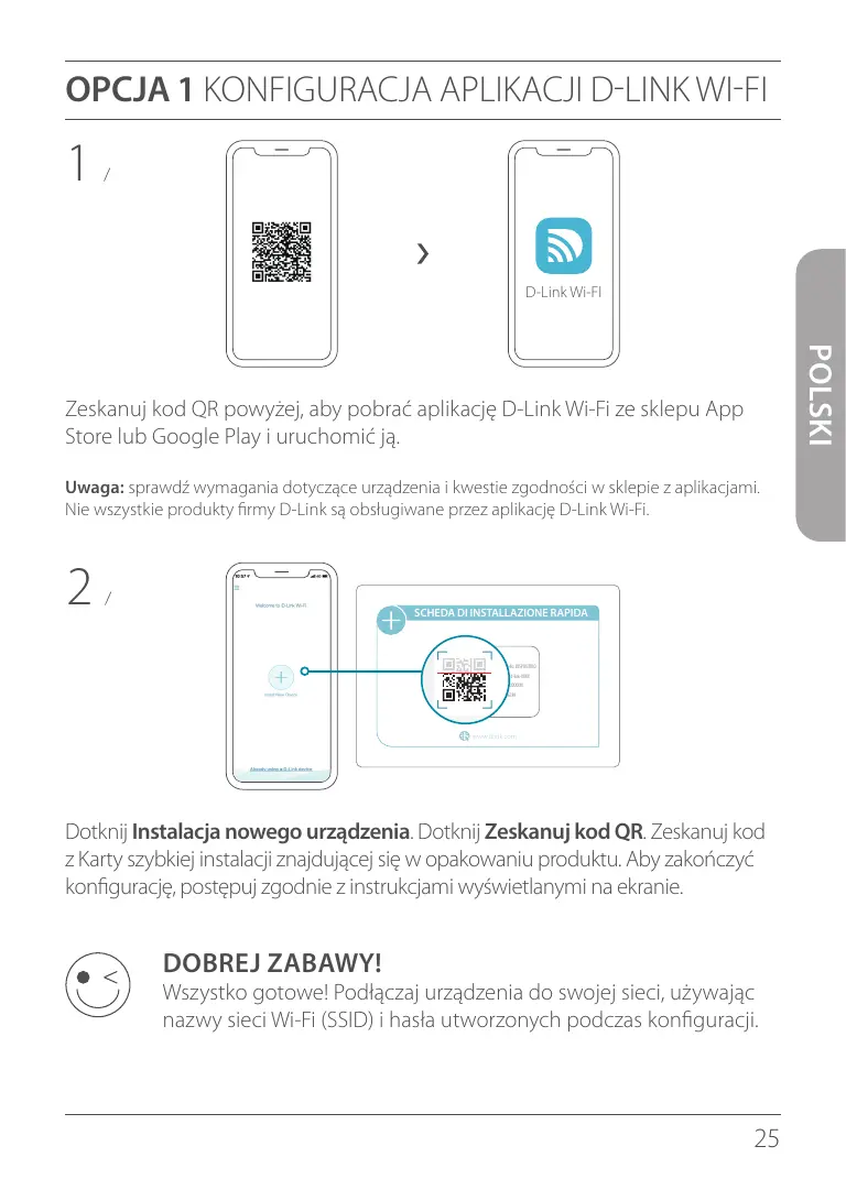 Nome modello: DISPOSITIVO Nome Wi-Fi: d-link-XXXX Password: XXXXXXXX S/N: 123456789 www.dlink.com Dotknij Instalacja nowego urządzenia. Dotknij Zeskanuj kod QR. Zeskanuj kod z Karty szybkiej instalacji znajdującej się w opakowaniu produktu.Aby zakończyć konfigurację, postępuj zgodnie z instrukcjami wyświetlanymi na ekranie. DOBREJ ZABAWY! Wszystko gotowe! Podłączaj urządzenia do swojej sieci, używając nazwy sieci Wi-Fi (SSID) i hasła utworzonych podczas konfiguracji.