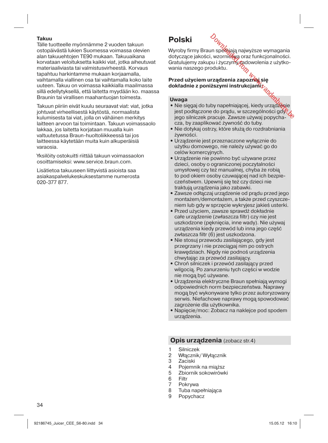 Uwaga • Nie sięgaj do tuby napełniającej, kiedy urządzenie jest podłączone do prądu, w szczególności gdy jego silniczek pracuje. Zawsze używaj popychacza, by zaaplikować żywność do tuby. • Nie dotykaj ostrzy, które służą do rozdrabniania żywności. • Urządzenie jest przeznaczone wyłącznie do użytku domowego, nie należy używać go do celów komercyjnych. • Urządzenie nie powinno być używane przez dzieci, osoby o ograniczonej poczytalności umysłowej czy też manualnej, chyba że robią to pod okiem osoby czuwającej nad ich bezpieczeństwem. Upewnij się też czy dzieci nie traktują urządzenia jako zabawki. • Zawsze odłączaj urządzenie od prądu przed jego montażem/demontażem, a także przed czyszczeniem lub gdy w sprzęcie wykryjesz jakieś usterki. • Przed użyciem, zawsze sprawdź dokładnie całe urządzenie (zwłaszcza filtr) czy nie jest uszkodzone (pęknięcia, inne wady). Nie używaj urządzenia kiedy przewód lub inna jego część zwłaszcza filtr (6) jest uszkodzona. • Nie stosuj przewodu zasilającego, gdy jest przegrzany i nie przeciągaj nim po ostrych krawędziach. Nigdy nie podnoś urządzenia chwytając za przewód zasilający. • Chroń silniczek i przewód zasilający przed wilgocią. Po zanurzeniu tych części w wodzie nie mogą być używane. • Urządzenia elektryczne Braun spełniają wymogi odpowiednich norm bezpieczeństwa. Naprawy mogą być wykonywane tylko przez autoryzowany serwis. Niefachowe naprawy mogą spowodować zagrożenie dla użytkownika. • Napięcie/moc: Zobacz na naklejce pod spodem urządzenia.