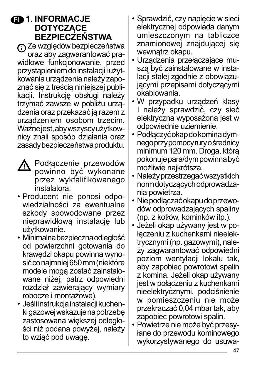 PL 1. INFORMACJE DOTYCZĄCE BEZPIECZEŃSTWA Ze względów bezpieczeństwa oraz aby zagwarantować prawidłowe funkcjonowanie, przed przystąpieniem do instalacji i użytkowania urządzenia należy zapoznać się z treścią niniejszej publikacji. Instrukcję obsługi należy trzymać zawsze w pobliżu urządzenia oraz przekazać ją razem z urządzeniem osobom trzecim. Ważne jest, aby wszyscy użytkownicy znali sposób działania oraz zasady bezpieczeństwa produktu. Podłączenie przewodów powinno być wykonane przez wykfalifikowanego instalatora. • Producent nie ponosi odpowiedzialności za ewentualne szkody spowodowane przez nieprawidłową instalację lub użytkowanie. • Minimalna bezpieczna odległość od powierzchni gotowania do krawędzi okapu powinna wynosić co najmniej 650 mm (niektóre modele mogą zostać zainstalowane niżej; patrz odpowiedni rozdział zawierający wymiary robocze i montażowe). • Jeśli instrukcja instalacji kuchenki gazowej wskazuje na potrzebę zastosowana większej odległości niż podana powyżej, należy to wziąć pod uwagę.