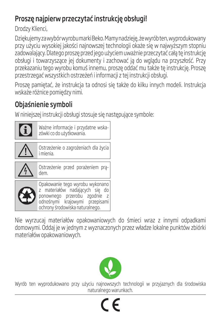 Dziekujemy za wyborwyrobumarki Beko. Mamynadzieje, zewyrob ten, wyprodukowany przy uzyciu wysokiej jakosci najnowszej technologii okazie sie w najwyszym stopniu zadowalajacy. Dlatego prosze przy得住aco uzymiem uwaznie przyczytać cala te instrukcję obstugi i towarzyszȩce jej Dokumenty i zachować ja do wgladu na przyszłosc. Przy przy bezakaniukiego wyrobu komuś innemu, prosze oddać mu takawe instrukcję. Prosze przyestręgać wzystkich ostrzeżen i informaci z tej instrukcjji obstugi.