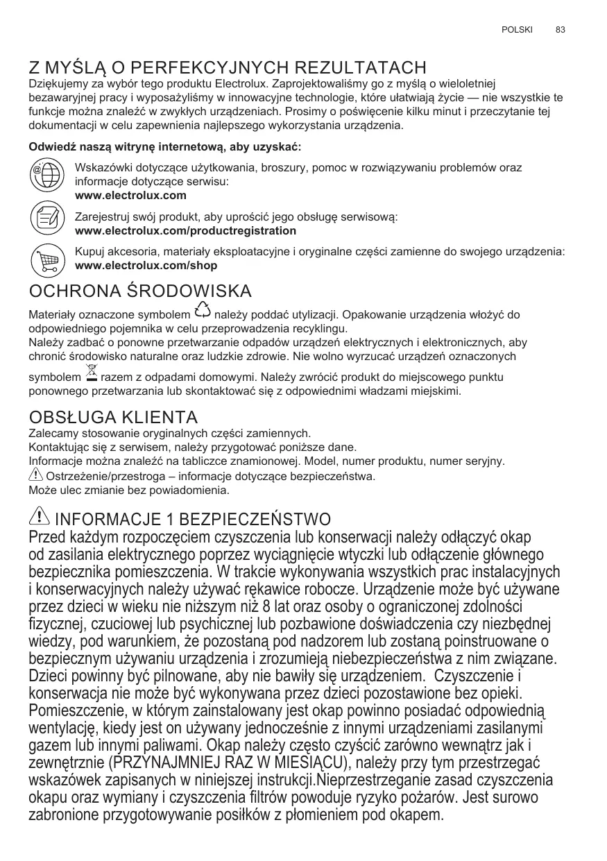 Dziękujemy za wybór tego produktu Electrolux. Zaprojektowaliśmy go z myślą o wieloletniej bezawaryjnej pracy i wyposażyliśmy w innowacyjne technologie, które ułatwiają życie — nie wszystkie te funkcje można znaleźć w zwykłych urządzeniach. Prosimy o poświęcenie kilku minut i przeczytanie tej dokumentacji w celu zapewnienia najlepszego wykorzystania urządzenia. Odwiedź naszą witrynę internetową, aby uzyskać: Wskazówki dotyczące użytkowania, broszury, pomoc w rozwiązywaniu problemów oraz informacje dotyczące serwisu: www.electrolux.com Zarejestruj swój produkt, aby uprościć jego obsługę serwisową: www.electrolux.com/productregistration Kupuj akcesoria, materiały eksploatacyjne i oryginalne części zamienne do swojego urządzenia: www.electrolux.com/shop OCHRONA ŚRODOWISKA Materiały oznaczone symbolem należy poddać utylizacji. Opakowanie urządzenia włożyć do odpowiedniego pojemnika w celu przeprowadzenia recyklingu. Należy zadbać o ponowne przetwarzanie odpadów urządzeń elektrycznych i elektronicznych, aby chronić środowisko naturalne oraz ludzkie zdrowie. Nie wolno wyrzucać urządzeń oznaczonych symbolem razem z odpadami domowymi. Należy zwrócić produkt do miejscowego punktu ponownego przetwarzania lub skontaktować się z odpowiednimi władzami miejskimi.