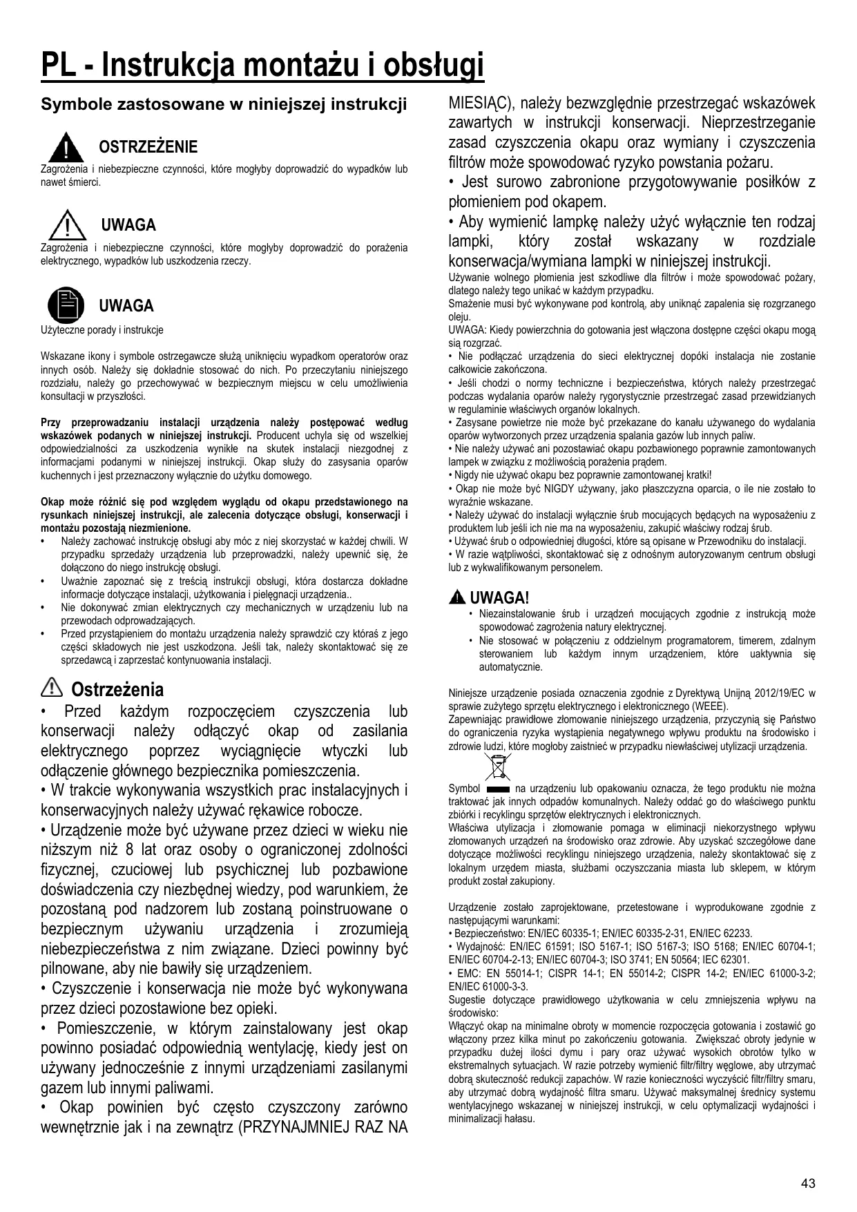 UWAGA Użyteczne porady i instrukcje Wskazane ikony i symbole ostrzegawcze służą uniknięciu wypadkom operatorów oraz innych osób. Należy się dokładnie stosować do nich. Po przeczytaniu niniejszego rozdziału, należy go przechowywać w bezpiecznym miejscu w celu umożliwienia konsultacji w przyszłości. Przy przeprowadzaniu instalacji urządzenia należy postępować według wskazówek podanych w niniejszej instrukcji. Producent uchyla się od wszelkiej odpowiedzialności za uszkodzenia wynikłe na skutek instalacji niezgodnej z informacjami podanymi w niniejszej instrukcji. Okap służy do zasysania oparów kuchennych i jest przeznaczony wyłącznie do użytku domowego. Okap może różnić się pod względem wyglądu od okapu przedstawionego na rysunkach niniejszej instrukcji, ale zalecenia dotyczące obsługi, konserwacji i montażu pozostają niezmienione. • Należy zachować instrukcję obsługi aby móc z niej skorzystać w każdej chwili. W przypadku sprzedaży urządzenia lub przeprowadzki, należy upewnić się, że dołączono do niego instrukcję obsługi. • Uważnie zapoznać się z treścią instrukcji obsługi, która dostarcza dokładne informacje dotyczące instalacji, użytkowania i pielęgnacji urządzenia.. • Nie dokonywać zmian elektrycznych czy mechanicznych w urządzeniu lub na przewodach odprowadzających. • Przed przystąpieniem do montażu urządzenia należy sprawdzić czy któraś z jego części składowych nie jest uszkodzona. Jeśli tak, należy skontaktować się ze sprzedawcą i zaprzestać kontynuowania instalacji.