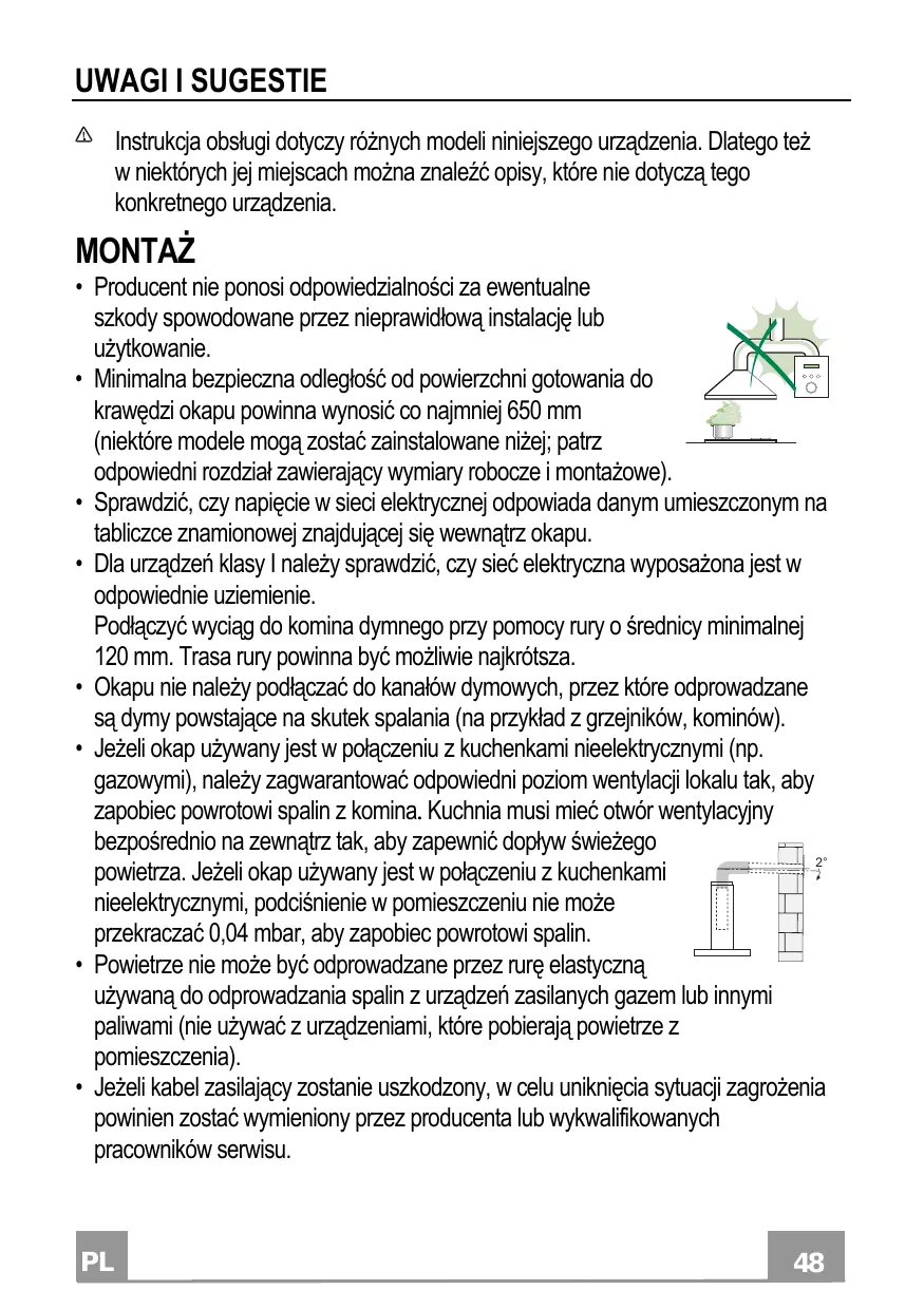 CONSIGLI E SUGGERIMENTI Le Istruzioni per l’uso si riferiscono ai diversi modelli di questo apparecchio. Pertanto, si potrebbero trovare descrizioni di singole caratteristiche che non appartengono al proprio apparecchio specifico. Assurez-vous que la tension de votre secteur correspond à celle indiquée sur la plaque des données appliquée à l’intérieur de la hotte. Pour les appareils de Classe I, s’assurer que l’installation électrique de votre intérieur dispose d’une mise à la terre adéquate. Relier l’aspirateur au conduit de cheminée avec un tube d’un diamètre minimum de 120 mm. Le parcours des fumées doit être le plus court possible. Ne pas relier la hotte aspirante aux conduits de cheminée qui 2° acheminent les fumées de combustion (par exemple de chaudières, de cheminées, etc.). Si vous utilisez l’aspirateur en combinaison avec des appareils non électriques (par ex. appareils à gaz), vous devez garantir un degré d’aération suffisant dans la pièce, afin d’empêcher le retour du flux des gaz de sortie. La cuisine doit présenter une ouverture communiquant directement vers l’extérieur pour garantir l’amenée d’air propre. Si vous utilisez la hotte de cuisine en combinaison avec des appareils non alimentés à l’électricité, la pression négative dans la pièce ne doit pas dépasser 0,04 mbar afin d’éviter que la hotte ne réaspire les fumées dans la pièce. Ne pas évacuer l’air à travers un tube flexible utilisé pour l’aspiration des fumées des appareils alimentés au gaz ou avec d’autres combustibles (ne pas utiliser avec des appareils ayant une seule sortie d’air dans la pièce). Si le cordon d’alimentation est endommagé, veuillez le faire remplacer par le fabricant ou par un service après-vente agréé pour éviter tout risque d’accident.