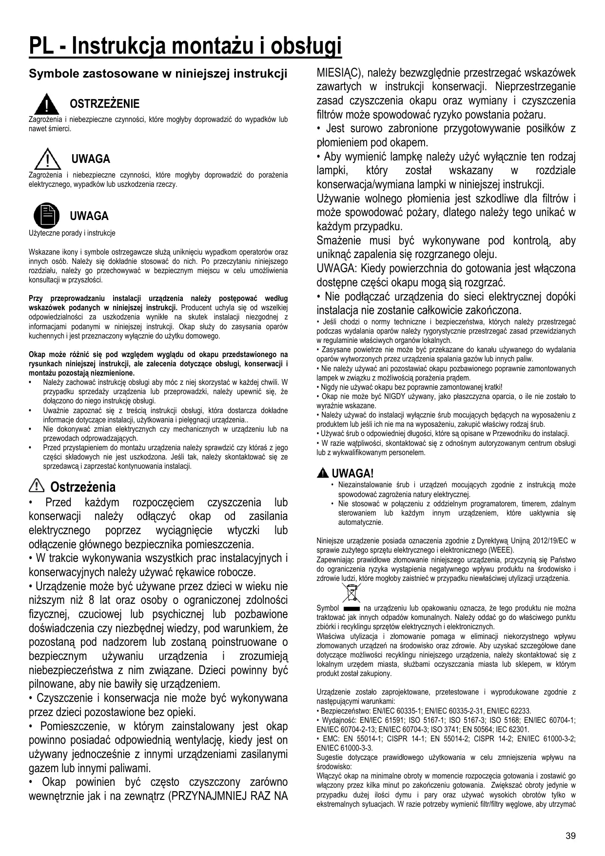 UWAGA Użyteczne porady i instrukcje Wskazane ikony i symbole ostrzegawcze służą uniknięciu wypadkom operatorów oraz innych osób. Należy się dokładnie stosować do nich. Po przeczytaniu niniejszego rozdziału, należy go przechowywać w bezpiecznym miejscu w celu umożliwienia konsultacji w przyszłości. Przy przeprowadzaniu instalacji urządzenia należy postępować według wskazówek podanych w niniejszej instrukcji. Producent uchyla się od wszelkiej odpowiedzialności za uszkodzenia wynikłe na skutek instalacji niezgodnej z informacjami podanymi w niniejszej instrukcji. Okap służy do zasysania oparów kuchennych i jest przeznaczony wyłącznie do użytku domowego. Okap może różnić się pod względem wyglądu od okapu przedstawionego na rysunkach niniejszej instrukcji, ale zalecenia dotyczące obsługi, konserwacji i montażu pozostają niezmienione. • Należy zachować instrukcję obsługi aby móc z niej skorzystać w każdej chwili. W przypadku sprzedaży urządzenia lub przeprowadzki, należy upewnić się, że dołączono do niego instrukcję obsługi. • Uważnie zapoznać się z treścią instrukcji obsługi, która dostarcza dokładne informacje dotyczące instalacji, użytkowania i pielęgnacji urządzenia.. • Nie dokonywać zmian elektrycznych czy mechanicznych w urządzeniu lub na przewodach odprowadzających. • Przed przystąpieniem do montażu urządzenia należy sprawdzić czy któraś z jego części składowych nie jest uszkodzona. Jeśli tak, należy skontaktować się ze sprzedawcą i zaprzestać kontynuowania instalacji.