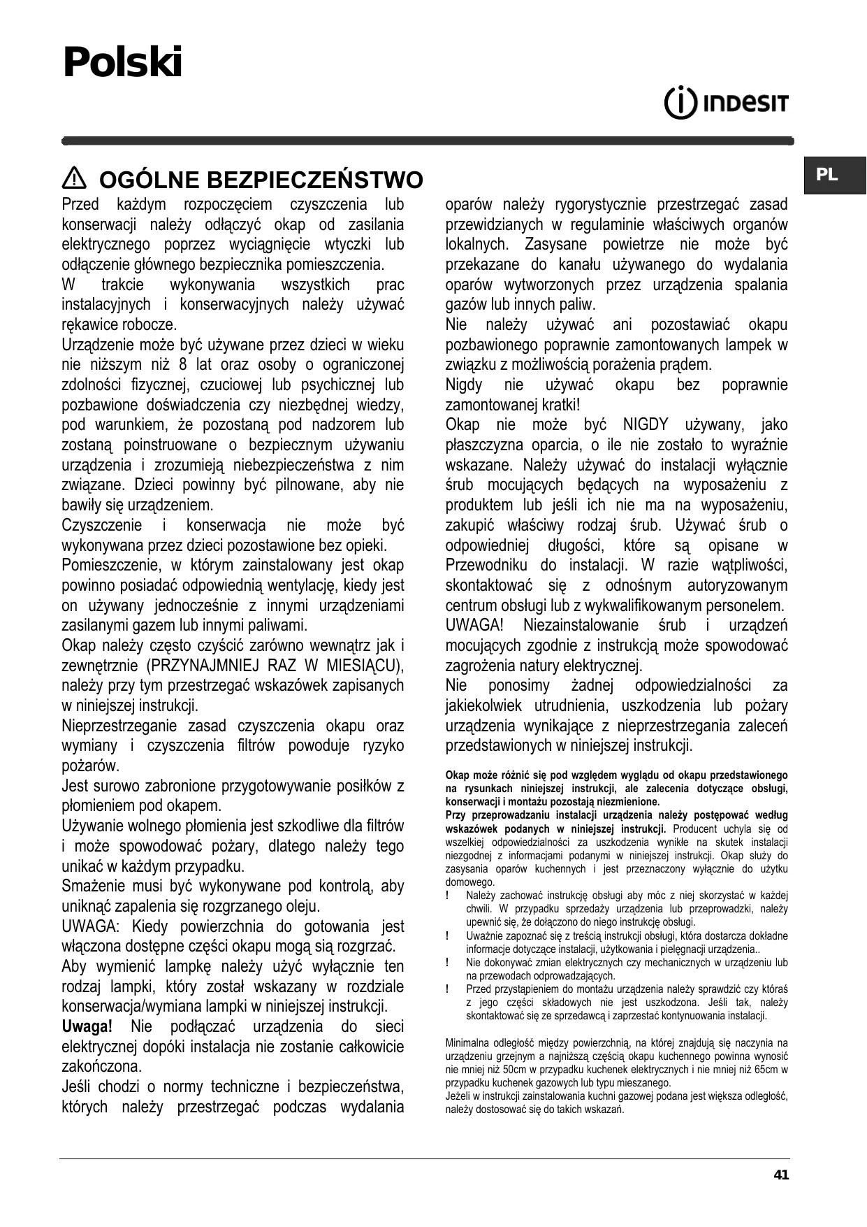 Polski OGÓLNE BEZPIECZEŃSTWO Przed każdym rozpoczęciem czyszczenia lub konserwacji należy odłączyć okap od zasilania elektrycznego poprzez wyciągnięcie wtyczki lub odłączenie głównego bezpiecznika pomieszczenia. W trakcie wykonywania wszystkich prac instalacyjnych i konserwacyjnych należy używać rękawice robocze. Urządzenie może być używane przez dzieci w wieku nie niższym niż 8 lat oraz osoby o ograniczonej zdolności fizycznej, czuciowej lub psychicznej lub pozbawione doświadczenia czy niezbędnej wiedzy, pod warunkiem, że pozostaną pod nadzorem lub zostaną poinstruowane o bezpiecznym używaniu urządzenia i zrozumieją niebezpieczeństwa z nim związane. Dzieci powinny być pilnowane, aby nie bawiły się urządzeniem. Czyszczenie i konserwacja nie może być wykonywana przez dzieci pozostawione bez opieki. Pomieszczenie, w którym zainstalowany jest okap powinno posiadać odpowiednią wentylację, kiedy jest on używany jednocześnie z innymi urządzeniami zasilanymi gazem lub innymi paliwami. Okap należy często czyścić zarówno wewnątrz jak i zewnętrznie (PRZYNAJMNIEJ RAZ W MIESIĄCU), należy przy tym przestrzegać wskazówek zapisanych w niniejszej instrukcji. Nieprzestrzeganie zasad czyszczenia okapu oraz wymiany i czyszczenia filtrów powoduje ryzyko pożarów. Jest surowo zabronione przygotowywanie posiłków z płomieniem pod okapem. Używanie wolnego płomienia jest szkodliwe dla filtrów i może spowodować pożary, dlatego należy tego unikać w każdym przypadku. Smażenie musi być wykonywane pod kontrolą, aby uniknąć zapalenia się rozgrzanego oleju. UWAGA: Kiedy powierzchnia do gotowania jest włączona dostępne części okapu mogą sią rozgrzać. Aby wymienić lampkę należy użyć wyłącznie ten rodzaj lampki, który został wskazany w rozdziale konserwacja/wymiana lampki w niniejszej instrukcji. Uwaga! Nie podłączać urządzenia do sieci elektrycznej dopóki instalacja nie zostanie całkowicie zakończona. Jeśli chodzi o normy techniczne i bezpieczeństwa, których należy przestrzegać podczas wydalania