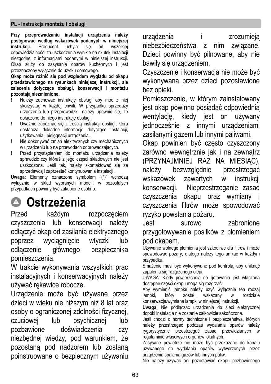 PL - Instrukcja montażu i obsługi Przy przeprowadzaniu instalacji urządzenia należy postępować według wskazówek podanych w niniejszej instrukcji. Producent uchyla się od wszelkiej odpowiedzialności za uszkodzenia wynikłe na skutek instalacji niezgodnej z informacjami podanymi w niniejszej instrukcji. Okap służy do zasysania oparów kuchennych i jest przeznaczony wyłącznie do użytku domowego. Okap może różnić się pod względem wyglądu od okapu przedstawionego na rysunkach niniejszej instrukcji, ale zalecenia dotyczące obsługi, konserwacji i montażu pozostają niezmienione. Należy zachować instrukcję obsługi aby móc z niej skorzystać w każdej chwili. W przypadku sprzedaży urządzenia lub przeprowadzki, należy upewnić się, że dołączono do niego instrukcję obsługi. Uważnie zapoznać się z treścią instrukcji obsługi, która dostarcza dokładne informacje dotyczące instalacji, użytkowania i pielęgnacji urządzenia.. Nie dokonywać zmian elektrycznych czy mechanicznych w urządzeniu lub na przewodach odprowadzających. Przed przystąpieniem do montażu urządzenia należy sprawdzić czy któraś z jego części składowych nie jest uszkodzona. Jeśli tak, należy skontaktować się ze sprzedawcą i zaprzestać kontynuowania instalacji. Uwaga: Elementy oznaczone symbolem “(*)” wchodzą wyłącznie w skład wybranych modeli, w pozostałych przypadkach powinny być zakupione osobno. urządzenia zrozumieją niebezpieczeństwa z nim związane. Dzieci powinny być pilnowane, aby nie bawiły się urządzeniem. Czyszczenie i konserwacja nie może być wykonywana przez dzieci pozostawione bez opieki. Pomieszczenie, w którym zainstalowany jest okap powinno posiadać odpowiednią wentylację, kiedy jest on używany jednocześnie z innymi urządzeniami zasilanymi gazem lub innymi paliwami. Okap powinien być często czyszczony zarówno wewnętrznie jak i na zewnątrz (PRZYNAJMNIEJ RAZ NA MIESIĄC), należy bezwzględnie przestrzegać wskazówek zawartych w instrukcji konserwacji. Nieprzestrzeganie zasad czyszczenia okapu oraz wymiany i czyszczenia filtrów może spowodować ryzyko powstania pożaru. Jest surowo zabronione przygotowywanie posiłków z płomieniem pod okapem. Ostrzeżenia Przed każdym rozpoczęciem czyszczenia lub konserwacji należy odłączyć okap od zasilania elektrycznego poprzez wyciągnięcie wtyczki lub odłączenie głównego bezpiecznika pomieszczenia. W trakcie wykonywania wszystkich prac instalacyjnych i konserwacyjnych należy używać rękawice robocze. Urządzenie może być używane przez dzieci w wieku nie niższym niż 8 lat oraz osoby o ograniczonej zdolności fizycznej, czuciowej lub psychicznej lub pozbawione doświadczenia czy niezbędnej wiedzy, pod warunkiem, że pozostaną pod nadzorem lub zostaną poinstruowane o bezpiecznym używaniu Używanie wolnego płomienia jest szkodliwe dla filtrów i może spowodować pożary, dlatego należy tego unikać w każdym przypadku. Smażenie musi być wykonywane pod kontrolą, aby uniknąć zapalenia się rozgrzanego oleju. UWAGA: Kiedy powierzchnia do gotowania jest włączona dostępne części okapu mogą sią rozgrzać. Aby wymienić lampkę należy użyć wyłącznie ten rodzaj lampki, który został wskazany rozdziale konserwacja/wymiana lampki w niniejszej instrukcji. Uwaga! Nie podłączać urządzenia do sieci elektrycznej dopóki instalacja nie zostanie całkowicie zakończona. Jeśli chodzi o normy techniczne i bezpieczeństwa, których należy przestrzegać podczas wydalania oparów należy rygorystycznie przestrzegać zasad przewidzianych w regulaminie właściwych organów lokalnych. Zasysane powietrze nie może być przekazane do kanału używanego do wydalania oparów wytworzonych przez urządzenia spalania gazów lub innych paliw. Nie należy używać ani pozostawiać okapu pozbawionego
