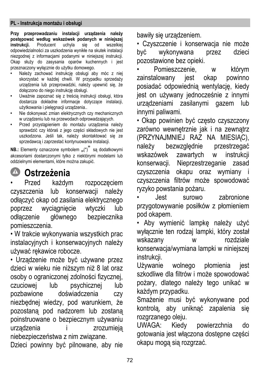 bawiły się urządzeniem. • Czyszczenie i konserwacja nie może być wykonywana przez dzieci pozostawione bez opieki. • Pomieszczenie, w którym zainstalowany jest okap powinno posiadać odpowiednią wentylację, kiedy jest on używany jednocześnie z innymi urządzeniami zasilanymi gazem lub innymi paliwami. • Okap powinien być często czyszczony zarówno wewnętrznie jak i na zewnątrz (PRZYNAJMNIEJ RAZ NA MIESIĄC), należy bezwzględnie przestrzegać wskazówek zawartych w instrukcji konserwacji. Nieprzestrzeganie zasad czyszczenia okapu oraz wymiany i czyszczenia filtrów może spowodować ryzyko powstania pożaru. • Jest surowo zabronione przygotowywanie posiłków z płomieniem pod okapem. • Aby wymienić lampkę należy użyć wyłącznie ten rodzaj lampki, który został wskazany w rozdziale konserwacja/wymiana lampki w niniejszej instrukcji. Używanie wolnego płomienia jest szkodliwe dla filtrów i może spowodować pożary, dlatego należy tego unikać w każdym przypadku. Smażenie musi być wykonywane pod kontrolą, aby uniknąć zapalenia się rozgrzanego oleju. UWAGA: Kiedy powierzchnia do gotowania jest włączona dostępne części okapu mogą sią rozgrzać.