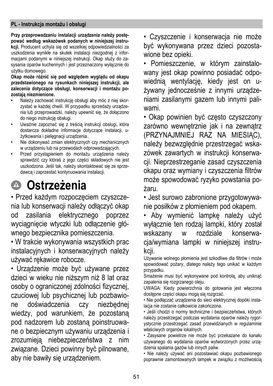 - Urządzenie może być używane przez dzieci w wieku nie niższym niż 8 lat oraz osoby o ograniczonej zdolności fizycznej, czuciowej lub psychicznej lub pozbawione doświadczenia czy niezbędnej wiedzy, pod warunkiem, że pozostaną pod nadzorem lub zostaną poinstruowane o bezpiecznym używaniu urządzenia i zrozumieją niebezpieczeństwa z nim związane. Dzieci powinny być pilnowane, aby nie bawiły się urządzeniem. Używanie wolnego płomienia jest szkodliwe dla filtrów i może spowodować pożary, dlatego należy tego unikać w każdym przypadku. Smażenie musi być wykonywane pod kontrolą, aby uniknąć zapalenia się rozgrzanego oleju. UWAGA: Kiedy powierzchnia do gotowania jest włączona dostępne części okapu mogą sią rozgrzać.