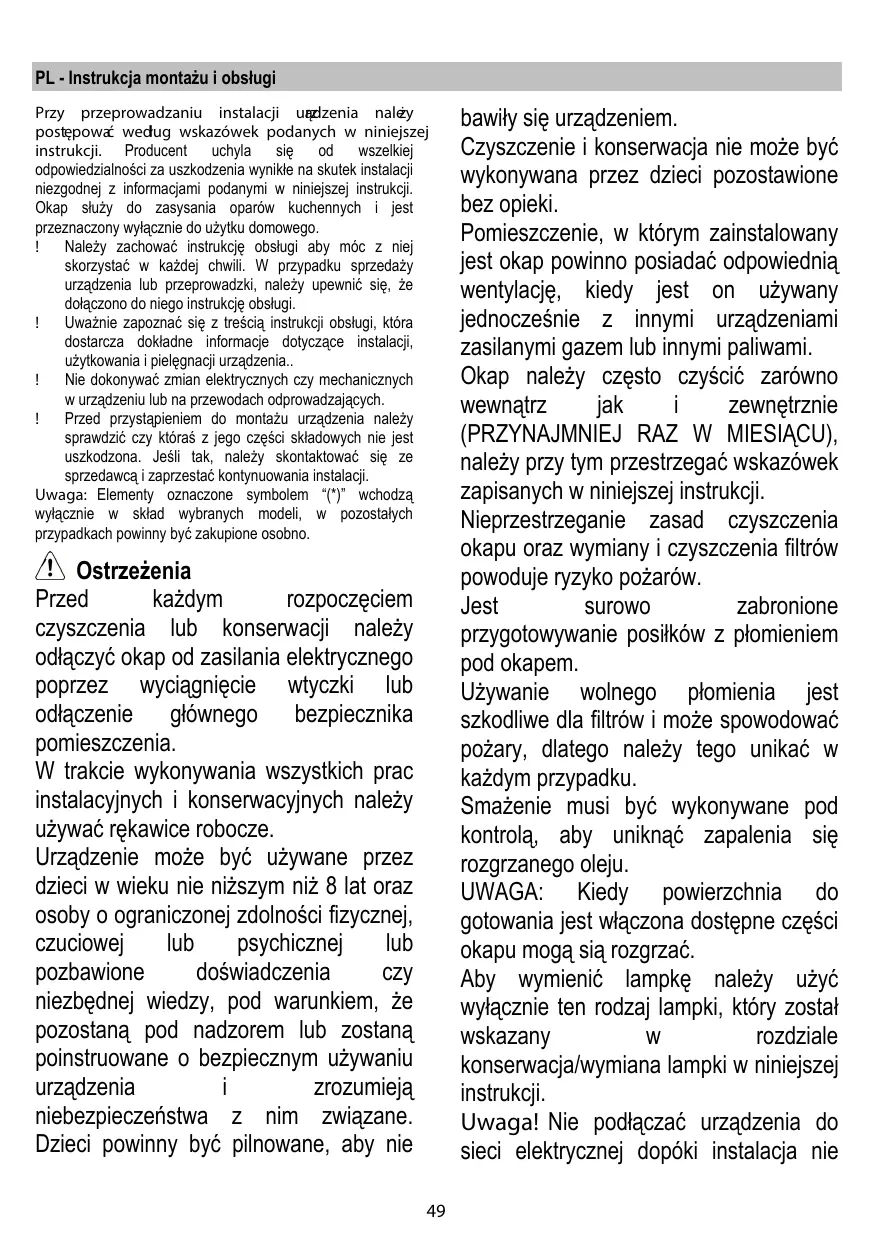 Le constructeur décline toute responsabilité pour tous les inconvénients, dommages ou incendies provoqués à l’appareil et dûs à la non observation des instructions de la présente notice. Cette hotte prévue pour l’aspiration des fumées et vapeurs de cuisson est destinée à un usage domestique exclusivement. ! Il est important de conserver ce livret pour pouvoir le consulter à tout moment. En cas de vente, de cession ou de déménagement, s’assurer qu’il reste avec le produit. ! Lire attentivement les instructions: il y a d’importantes informations sur l’installation, sur l’emploi et sur la sécurité. ! Ne pas effectuer des modifications électriques ou mécaniques sur le produit ou sur les conduit d’évacuation. ! Avant d'installer l'appareil, vérifiez qu’il n’y a aucun composant endommagé. Sinon, contactez votre revendeur et ne pas continuer l'installation. Note: les pièces indiquées avec le symbole “(*)” sont des accessoires optionnels qui sont fournies uniquement avec certains modèles ou des pièces non fournies qui doivent être achetées.
