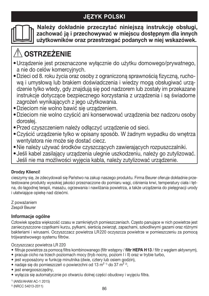 - Jeśli kabel zasilający urządzenia ulegnie uszkodzeniu, należy go zutylizować. Jeśli nie ma możliwości wyjęcia kabla, należy zutylizować urządzenie. Drodzy Klienci! cieszymy się, że zdecydowali się Państwo na zakup naszego produktu. Firma Beurer oferuje dokładnie przetestowane produkty wysokiej jakości przeznaczone do pomiaru wagi, ciśnienia krwi, temperatury ciała i tętna, do łagodnej terapii, masażu, ogrzewania i nawilżania powietrza, a także urządzenia do pielęgnacji urody i ułatwiające opiekę nad dziećmi. Z poważaniem Zespół Beurer Informacje ogólne Człowiek spędza większość czasu w zamkniętych pomieszczeniach. Często panujące w nich powietrze jest zanieczyszczone cząstkami kurzu, pyłkami, sierścią zwierząt, zapachami, szkodliwymi gazami oraz różnymi bakteriami i wirusami. Oczyszczacz powietrza LR 220 oczyszcza powietrze w pomieszczeniu za pomocą trójwarstwowego systemu filtrów. Oczyszczacz powietrza LR 220