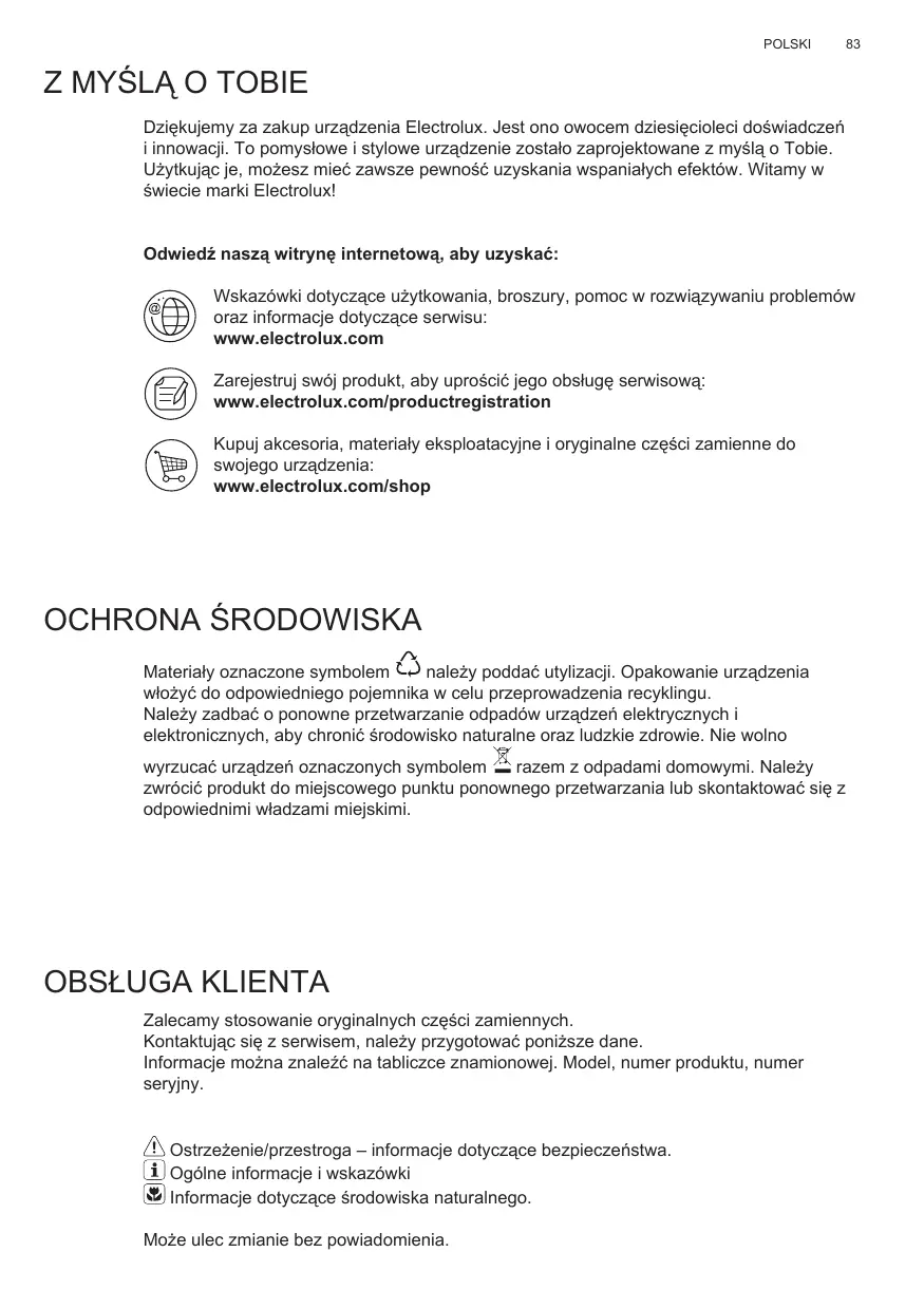 Dziekujemy za zakup urzadzenia Electrolux. jest ono owocem dziesiecioleci dośćczymi innowacji. To pomysłowe i stylowe urzadzenia zostalo zaprojektowane z myśla o Tobie. Uzytkujęc je, sąszmić zawsze pewnosć uzyskania wspaniałych efektów. Witamy w swiecie marki Electrolux!