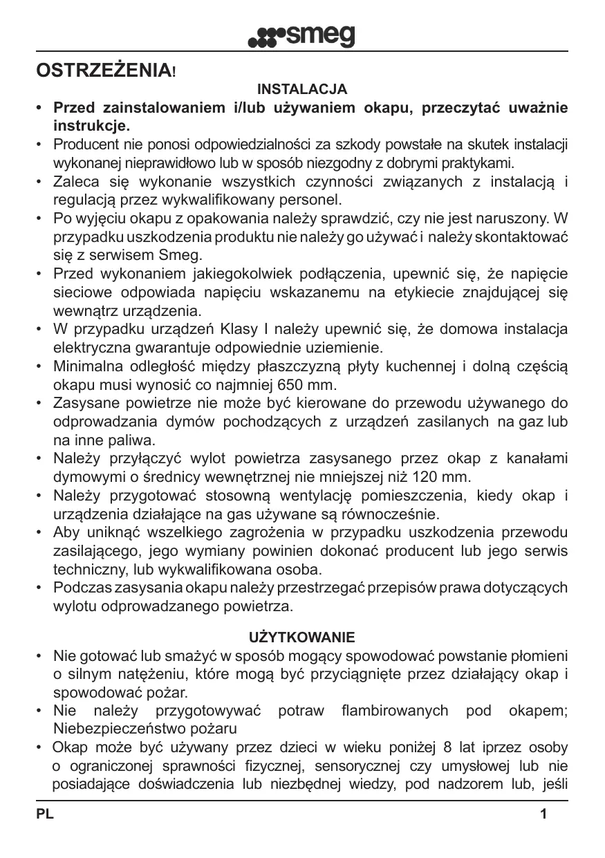 Lorsque la hotte est enlevée de l'emballage, en vérifier son état. Si le produit est endommagé, ne pas l'utiliser et contacter le réseau d'assistance Smeg. Avant d'effectuer tout raccordement, s'assurer que la tension de réseau corresponde à la tension indiquée sur l'étiquette caractéristique située à l'intérieur de l'appareil. Pour les appareils de Classe I, vérifier que l'installation électrique domestique garantisse un déchargement à la terre correct. La distance minimum entre la plaque de cuisson et la partie inférieure de la hotte doit être d'au moins 650 mm. L’air aspiré ne doit pas être convoyé dans un conduit utilisé pour l’évacuation des fumées des appareils alimentés au gaz ou avec d’autres combustibles. Raccorder la sortie de l'air aspiré par la hotte aux conduits d'évacuation des fumées d'un diamètre interne adéquat et non inférieur à 120 mm. Prévoir toujours une aération adéquate du local lorsque la hotte ou les appareils à gaz sont utilisés en même temps. Si le câble d'alimentation est endommagé, il doit être remplacé par le fabricant ou par son service d'assistance technique ou de toute façon par une personne ayant une qualification similaire afin de prévenir tout risque. Respecter les prescriptions de lois concernant l'expulsion de l'air à évacuer dans le fonctionnement aspirant de la hotte.