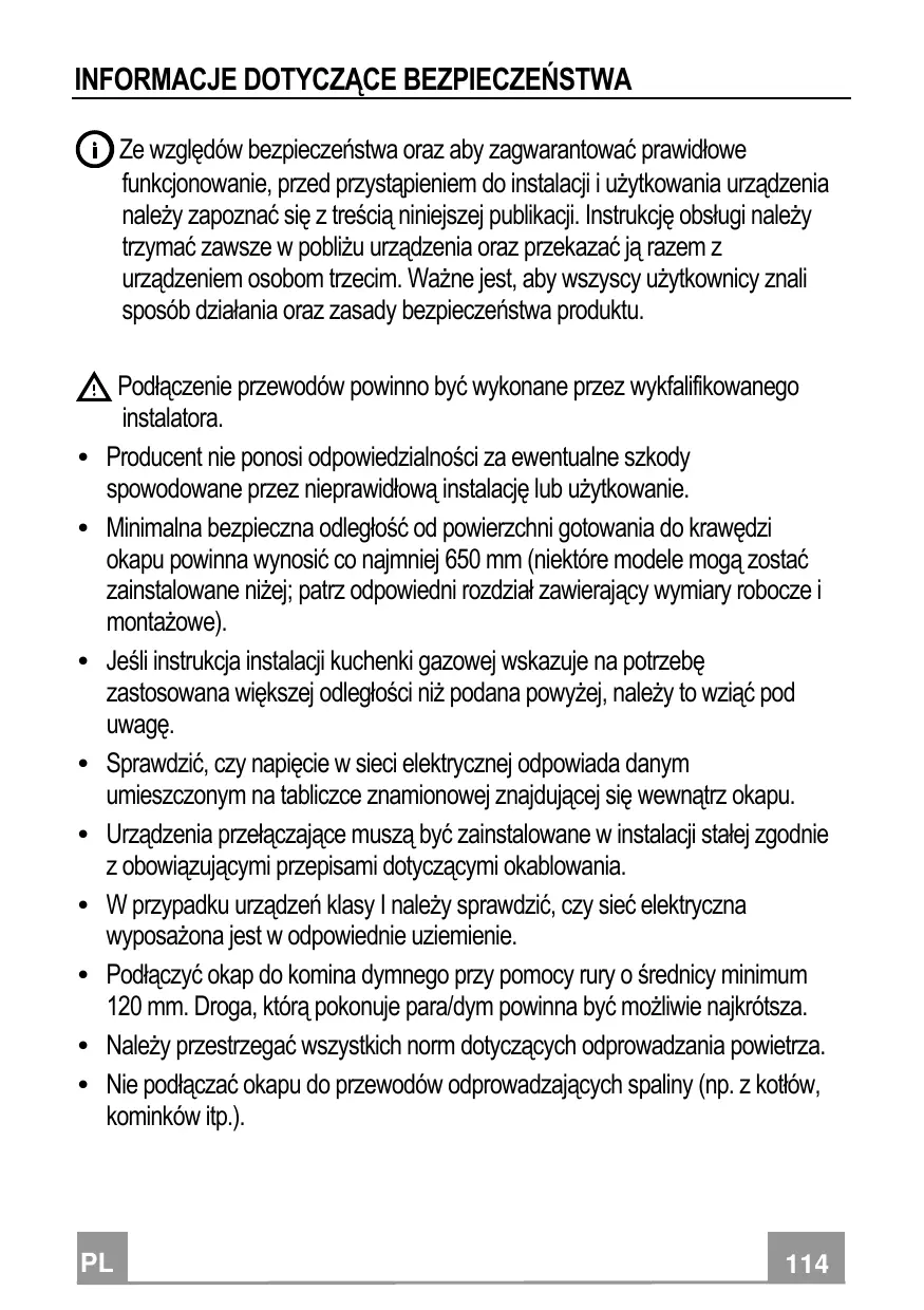 Podłączenie przewodów powinno być wykonane przez wykfalifikowanego instalatora. Producent nie ponosi odpowiedzialności za ewentualne szkody spowodowane przez nieprawidłową instalację lub użytkowanie. Minimalna bezpieczna odległość od powierzchni gotowania do krawędzi okapu powinna wynosić co najmniej 650 mm (niektóre modele mogą zostać zainstalowane niżej; patrz odpowiedni rozdział zawierający wymiary robocze i montażowe). Jeśli instrukcja instalacji kuchenki gazowej wskazuje na potrzebę zastosowana większej odległości niż podana powyżej, należy to wziąć pod uwagę. Sprawdzić, czy napięcie w sieci elektrycznej odpowiada danym umieszczonym na tabliczce znamionowej znajdującej się wewnątrz okapu. Urządzenia przełączające muszą być zainstalowane w instalacji stałej zgodnie z obowiązującymi przepisami dotyczącymi okablowania. W przypadku urządzeń klasy I należy sprawdzić, czy sieć elektryczna wyposażona jest w odpowiednie uziemienie. Podłączyć okap do komina dymnego przy pomocy rury o średnicy minimum 120 mm. Droga, którą pokonuje para/dym powinna być możliwie najkrótsza. Należy przestrzegać wszystkich norm dotyczących odprowadzania powietrza. Nie podłączać okapu do przewodów odprowadzających spaliny (np. z kotłów, kominków itp.).