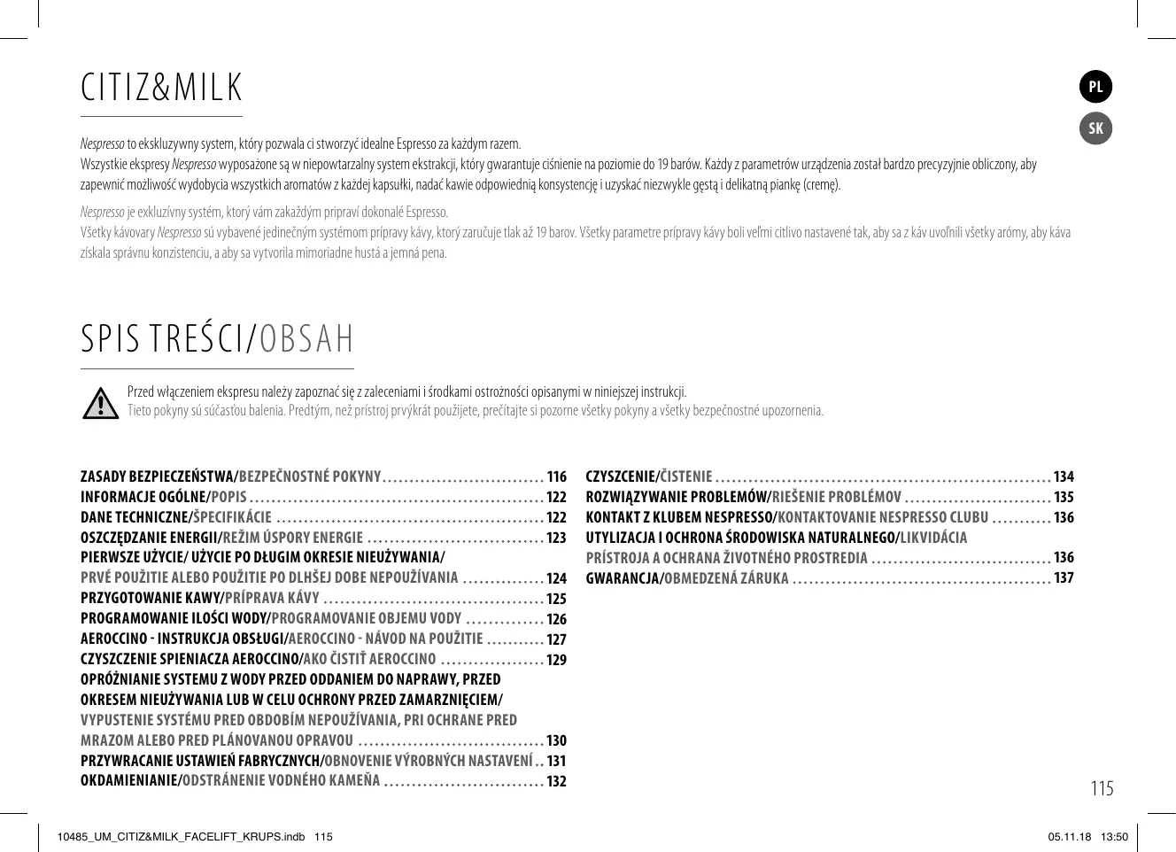 ZASADY BEZPIECZEŃSTWA/BEZPEČNOSTNÉ POKYNY INFORMACJE OGÓLNE/POPIS DANE TECHNICZNE/ŠPECIFIKÁCIE OSZCZĘDZANIE ENERGII/REŽIM ÚSPORY ENERGIE PIERWSZE UŻYCIE/ UŻYCIE PO DŁUGIM OKRESIE NIEUŻYWANIA/ PRVÉ POUŽITIE ALEBO POUŽITIE PO DLHŠEJ DOBE NEPOUŽÍVANIA PRZYGOTOWANIE KAWY/PRÍPRAVA KÁVY PROGRAMOWANIE ILOŚCI WODY/PROGRAMOVANIE OBJEMU VODY AEROCCINO - INSTRUKCJA OBSŁUGI/AEROCCINO - NÁVOD NA POUŽITIE CZYSZCZENIE SPIENIACZA AEROCCINO/AKO ČISTIŤ AEROCCINO OPRÓŻNIANIE SYSTEMU Z WODY PRZED ODDANIEM DO NAPRAWY, PRZED OKRESEM NIEUŻYWANIA LUB W CELU OCHRONY PRZED ZAMARZNIĘCIEM/ VYPUSTENIE SYSTÉMU PRED OBDOBÍM NEPOUŽÍVANIA, PRI OCHRANE PRED MRAZOM ALEBO PRED PLÁNOVANOU OPRAVOU PRZYWRACANIE USTAWIEŃ FABRYCZNYCH/OBNOVENIE VÝROBNÝCH NASTAVENÍ OKDAMIENIANIE/ODSTRÁNENIE VODNÉHO KAMEŇA 10485_UM_CITIZ&MILK_FACELIFT_KRUPS.indb 115
