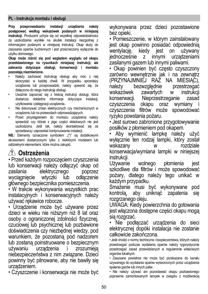 Przy przeprowadzaniu instalacji urządzenia należy postępować według wskazówek podanych w niniejszej instrukcji. Producent uchyla się od wszelkiej odpowiedzialności za uszkodzenia wynikłe na skutek instalacji niezgodnej z informacjami podanymi w niniejszej instrukcji. Okap służy do zasysania oparów kuchennych i jest przeznaczony wyłącznie do użytku domowego. Okap może różnić się pod względem wyglądu od okapu przedstawionego na rysunkach niniejszej instrukcji, ale zalecenia dotyczące obsługi, konserwacji i montażu pozostają niezmienione. • Należy zachować instrukcję obsługi aby móc z niej skorzystać w każdej chwili. W przypadku sprzedaży urządzenia lub przeprowadzki, należy upewnić się, że dołączono do niego instrukcję obsługi. • Uważnie zapoznać się z treścią instrukcji obsługi, która dostarcza dokładne informacje dotyczące instalacji, użytkowania i pielęgnacji urządzenia.. • Nie dokonywać zmian elektrycznych czy mechanicznych w urządzeniu lub na przewodach odprowadzających. • Przed przystąpieniem do montażu urządzenia należy sprawdzić czy któraś z jego części składowych nie jest uszkodzona. Jeśli tak, należy skontaktować się ze sprzedawcą i zaprzestać kontynuowania instalacji. NB.: Elementy oznaczone symbolem „(*)” są dodatkowymi akcesoriami dostarczonymi tylko z niektórymi modelami lub oddzielnymi elementami, które można zakupić.