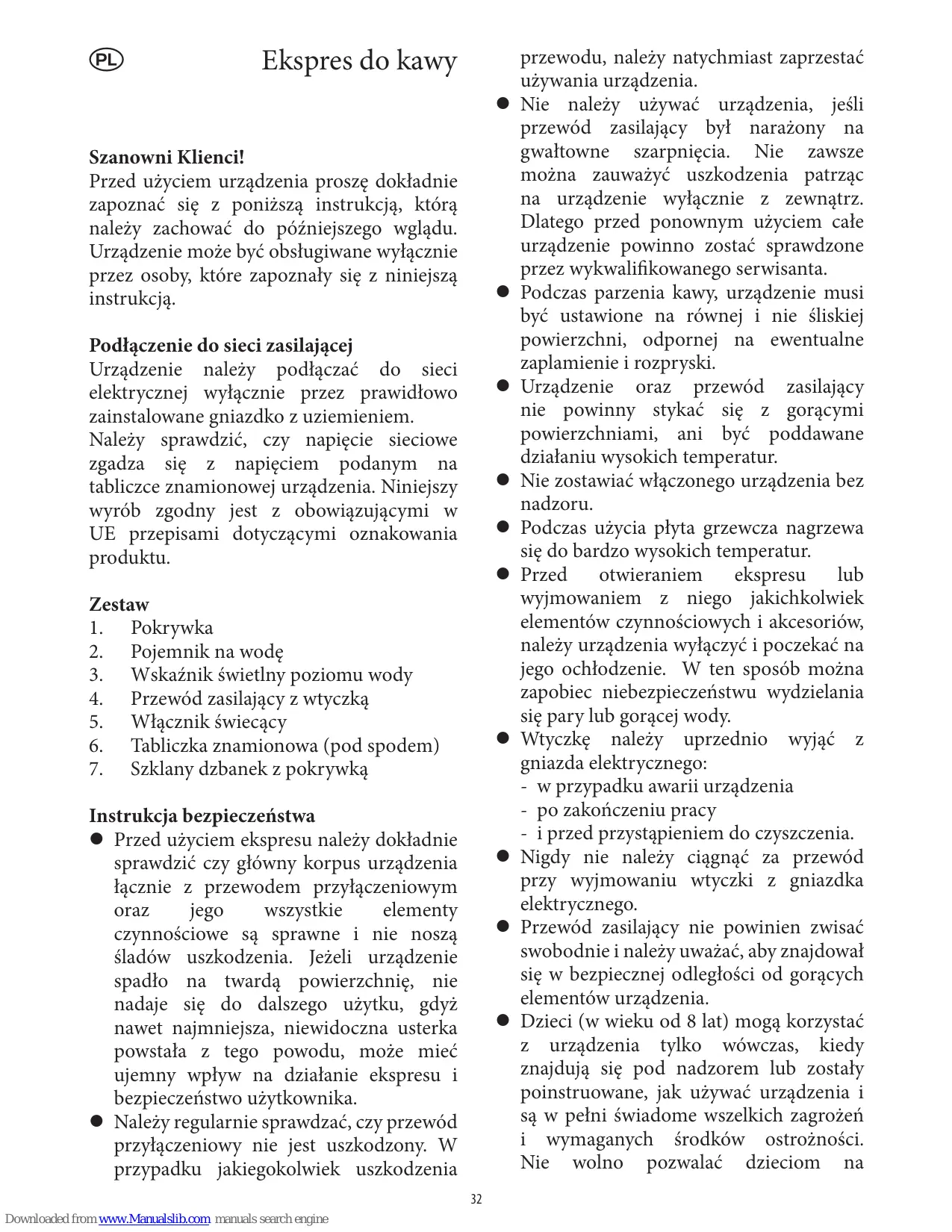 Downloaded from www.Manualslib.com manuals search engine przewodu, należy natychmiast zaprzestać używania urządzenia. Nie należy używać urządzenia, jeśli przewód zasilający był narażony na gwałtowne szarpnięcia. Nie zawsze można zauważyć uszkodzenia patrząc na urządzenie wyłącznie z zewnątrz. Dlatego przed ponownym użyciem całe urządzenie powinno zostać sprawdzone przez wykwalifikowanego serwisanta. Podczas parzenia kawy, urządzenie musi być ustawione na równej i nie śliskiej powierzchni, odpornej na ewentualne zaplamienie i rozpryski. Urządzenie oraz przewód zasilający nie powinny stykać się z gorącymi powierzchniami, ani być poddawane działaniu wysokich temperatur. Nie zostawiać włączonego urządzenia bez nadzoru. Podczas użycia płyta grzewcza nagrzewa się do bardzo wysokich temperatur. Przed otwieraniem ekspresu lub wyjmowaniem z niego jakichkolwiek elementów czynnościowych i akcesoriów, należy urządzenia wyłączyć i poczekać na jego ochłodzenie. W ten sposób można zapobiec niebezpieczeństwu wydzielania się pary lub gorącej wody. Wtyczkę należy uprzednio wyjąć z gniazda elektrycznego: - w przypadku awarii urządzenia - po zakończeniu pracy - i przed przystąpieniem do czyszczenia. Nigdy nie należy ciągnąć za przewód przy wyjmowaniu wtyczki z gniazdka elektrycznego. Przewód zasilający nie powinien zwisać swobodnie i należy uważać, aby znajdował się w bezpiecznej odległości od gorących elementów urządzenia. Dzieci (w wieku od 8 lat) mogą korzystać z urządzenia tylko wówczas, kiedy znajdują się pod nadzorem lub zostały poinstruowane, jak używać urządzenia i są w pełni świadome wszelkich zagrożeń i wymaganych środków ostrożności. Nie wolno pozwalać dzieciom na