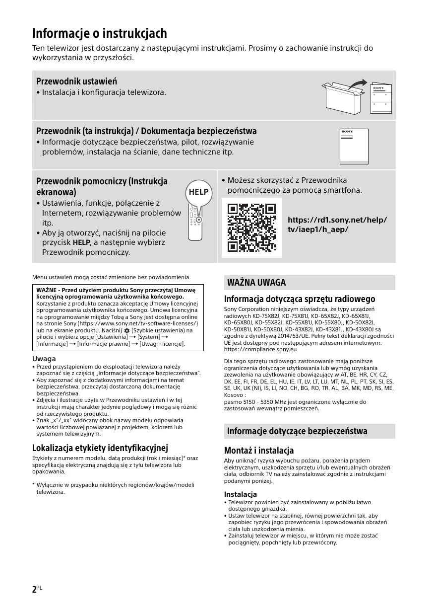 WAŻNA UWAGA Informacja dotycząca sprzętu radiowego Sony Corporation niniejszym oświadcza, że typy urządzeń radiowych KD-75X82J, KD-75X81J, KD-65X82J, KD-65X81J, KD-65X80J, KD-55X82J, KD-55X81J, KD-55X80J, KD-50X82J, KD-50X81J, KD-50X80J, KD-43X82J, KD-43X81J, KD-43X80J są zgodne z dyrektywą 2014/53/UE. Pełny tekst deklaracji zgodności UE jest dostępny pod następującym adresem internetowym: https://compliance.sony.eu Dla tego sprzętu radiowego zastosowanie mają poniższe ograniczenia dotyczące użytkowania lub wymóg uzyskania zezwolenia na użytkowanie obowiązujący w AT, BE, HR, CY, CZ, DK, EE, FI, FR, DE, EL, HU, IE, IT, LV, LT, LU, MT, NL, PL, PT, SK, SI, ES, SE, UK, UK (NI), IS, LI, NO, CH, BG, RO, TR, AL, BA, MK, MD, RS, ME, Kosovo : pasmo 5150 - 5350 MHz jest ograniczone wyłącznie do zastosowań wewnątrz pomieszczeń.