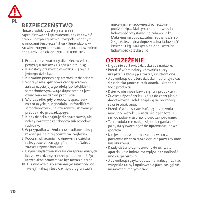 BEZPIECZEŃSTWO Nasze produkty zostały starannie zaprojektowane i sprawdzone, aby zapewnić dziecku bezpieczeństwo i wygodę. Zgodny z wymogami bezpieczeństwa – Sprawdzony w zatwierdzonym laboratorium z postanowieniem nr 91-1292 - grudzień 1991 - EN1888:2012.