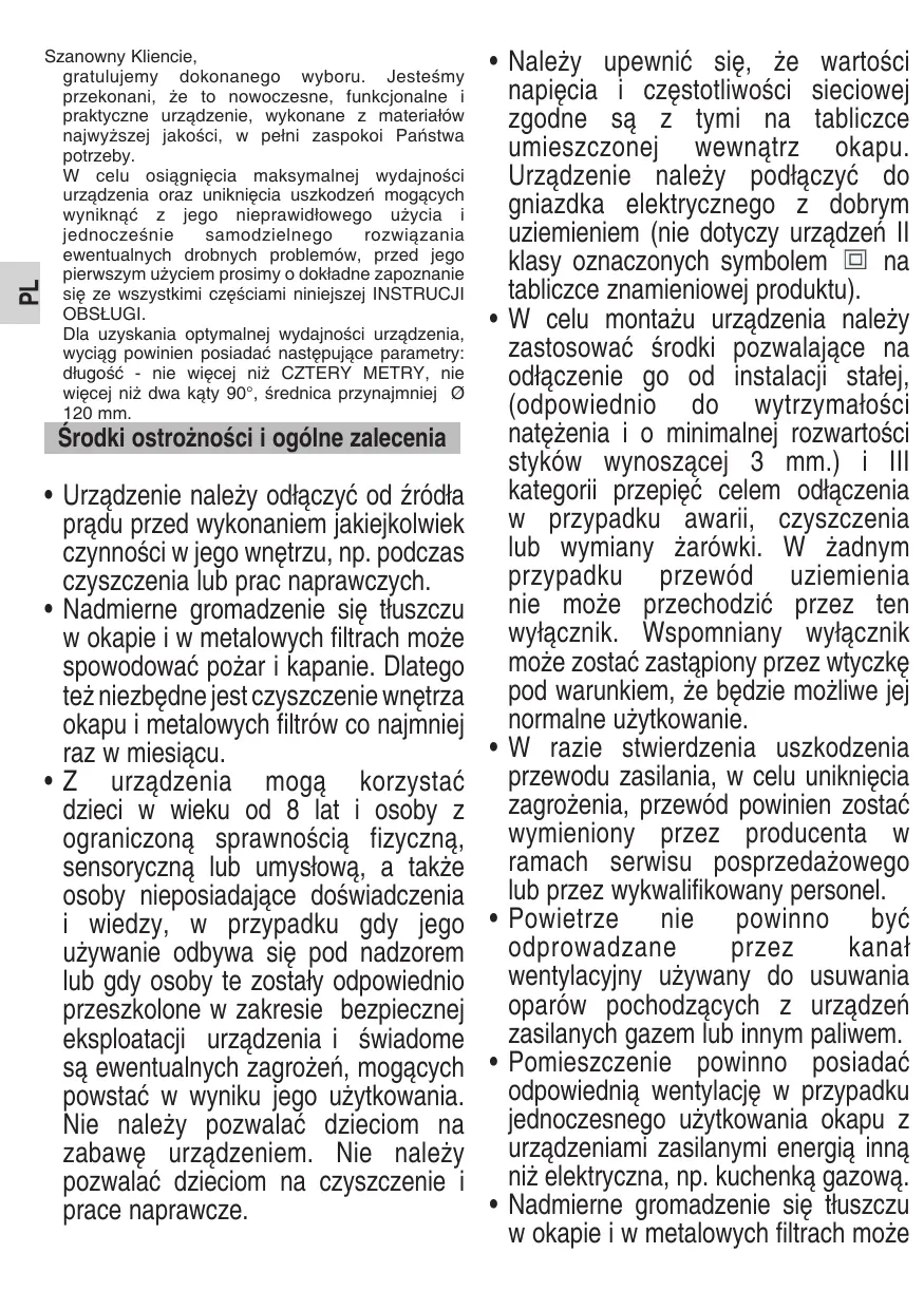 • Évitez de cuisiner sous la hotte sans les filtres métalliques, par exemple pendant qu’ils sont lavés dans le lave-vaisselle. • Nous vous conseillons d’utiliser des gants et de porter une attention particulière pendant le nettoyage de l’intérieur de la hotte. • Votre hotte est destinée à un usage domestique et uniquement pour l’extraction et la purification des gaz en provenance de la préparation d’aliments. Une utilisation différente pourrait être dangereuse et vous en serez totalement responsable. Le fabricant ne répond pas en cas de dommage causé par un usage incorrect de l’appareil. • Si vous avez besoin d’une réparation, vous devrez contacter le Service d’Assistance Technique du fabricant le plus proche et n’utiliser que des rechanges originaux.