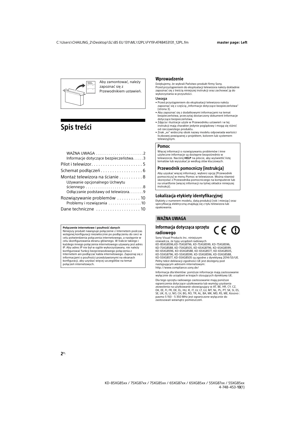 Satelita < 7 mm < 1,5 mm Odtwarzacz DVD wyposażony w wyjście komponentowe Zestaw audio Urządzenie wyposażone w wejście HDMI optycznego przesyłu sygnału audio 6PL KD-85XG85xx / 75XG87xx / 75XG85xx / 65XG87xx / 65XG85xx / 55XG87xx / 55XG85xx 4-748-453-13(1) C:\Users\CHAILING_2\Desktop\SL\85 EU 131\ML\12PL\FY19\4748453131_12PL.fm