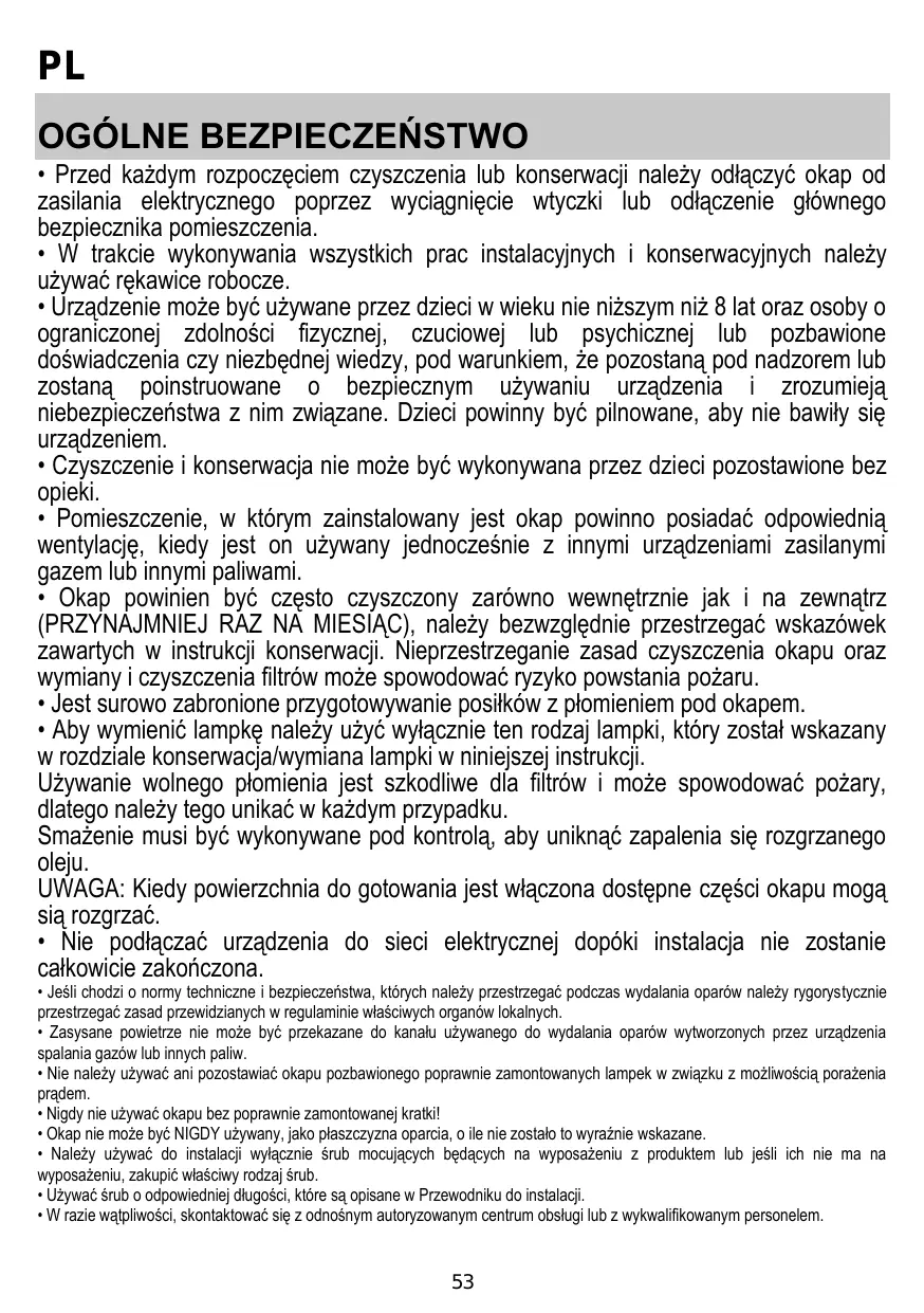 • Les enfants ne doivent pas jouer avec l’appareil. • Le nettoyage et l’entretien par l’usager ne doivent pas être effectués par des enfants sans surveillance. • La pièce doit avoir une aération suffisante lorsque la hotte est utilisée conjointement avec d'autres appareils fonctionnant au gaz ou autres combustibles. • La hotte doit être régulièrement nettoyée à la fois à l'intérieur et à l'extérieur (AU MOINS UNE FOIS PAR MOIS); cela devrait se faire en conformité avec les instructions d'entretien. Le non respect des instructions expressément fournies concernant le nettoyage de la hotte et des filtres peut provoquer des risques d'incendie. • Ne pas flamber d’aliments sous la hotte. • Pour le remplacement de la lampe, utilisez uniquement le type de lampe spécifié dans la section remplacement/maintenance lampe dans ce manuel. L'utilisation d'une flamme nue est dommageable pour les filtres et peut causer un incendie, par conséquent, il est déconseillé de l'utiliser. La friture doit être faite avec soin afin de s’assurer que l’huile surchauffée ne prenne pas feu. AVERTISSEMENT: Lorsque la table de cuisson est en fonctionnement, les parties accessibles de la hotte peuvent devenir très chaudes. • Ne pas brancher l'appareil au réseau électrique avant que l'installation ne soit complètement terminée. • En ce qui concerne les mesures techniques et de sécurité à prendre pour l'évacuation des fumées, respectez strictement les dispositions des règlements locales. • L’air ne doit pas être envoyé dans un conduit utilisé pour évacuer les fumées d’appareils utilisant du gaz ou un autre combustible. • Ne pas utiliser ou laisser la hotte sans les lampes correctement montées, car un éventuel risque de choc électrique est possible. • N’utilisez jamais la hotte sans la grille montée correctement! • La hotte ne doit JAMAIS être utilisée comme une surface d'appui, sauf indication expresse. • Utilisez uniquement les vis de fixation fournies avec le produit pour l'installation, ou, si non fournies, acheter le type correct de vis. • Utilisez la longueur correcte pour les vis qui sont identifiées dans le Guide d'installation. • En cas de doute, consultez votre centre de service agréé ou du personnel qualifié.